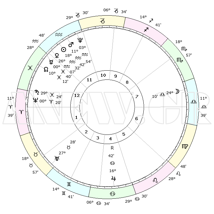 | | ΘΕΣΕΙΣ ΠΛΑΝΗΤΩΝ ΑΣΤΡΟΛΟΓΙΚΟΥ ΧΑΡΤΗ ΤΗΣ ΣΤΙΓΜΗΣ ΑΥΤΗΣ | | | | Πλανήτης | Ζώδιο | Μοίρες | Δεκαήμ. | Σε οίκο | Απόκλιση | | Ακμές των οίκων | | Ηλιος | Υδροχόος | 18°29' | Δεύτερο | 12 | 15 S 17 | | 1ος | 06°07' | Ιχθείς | | Σελήνη | Ζυγός | 23°25' | Τρίτο | 8 | 12 S 30 | | 2ος | 20°55' | Κριός | | Ερμής | Ιχθείς | 00°34' | Πρώτο | 12 | 12 S 29 | | 3ος | 22°27' | Ταύρος | | Αφροδίτη | Υδροχόος | 26°03' | Τρίτο | 12 | 14 S 11 | | 4ος | 16°17' | Δίδυμοι | | Αρης | Υδροχόος | 11°39' | Δεύτερο | 12 | 18 S 18 | | 5ος | 07°58' | Καρκίνος | | Δίας | Καρκίνος | 16°42'R | Δεύτερο | 5 | 22 N 42 | | 6ος | 02°11' | Λέων | | Κρόνος | Ιχθείς | 29°24' | Τρίτο | 1 | 02 S 14 | | 7ος | 06°07' | Παρθένος | | Ουρανός | Ταύρος | 27°28' | Τρίτο | 3 | 19 N 24 | | 8ος | 20°55' | Ζυγός | | Ποσειδώνας | Κριός | 00°19' | Πρώτο | 1 | 01 S 05 | | 9ος | 22°27' | Σκορπιός | | Πλούτωνας | Υδροχόος | 03°54' | Πρώτο | 12 | 22 S 59 | | 10ος | 16°17' | Τοξότης | | Β. Δεσμός | Ιχθείς | 10°12' | Δεύτερο | 1 | 07 S 45 | | 11ος | 07°58' | Αιγόκερως | | Ωροσκόπος | Ιχθείς | 06°07' | Πρώτο | | | 12ος | 02°11' | Υδροχόος | | Μεσουράνημα | Τοξότης | 16°17' | Δεύτερο | | | |