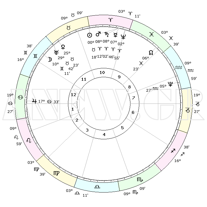 | | ΘΕΣΕΙΣ ΠΛΑΝΗΤΩΝ ΑΣΤΡΟΛΟΓΙΚΟΥ ΧΑΡΤΗ ΤΗΣ ΣΤΙΓΜΗΣ ΑΥΤΗΣ | | | | Πλανήτης | Ζώδιο | Μοίρες | Δεκαήμ. | Σε οίκο | Απόκλιση | | Ακμές των οίκων | | Ηλιος | Ταύρος | 00°14' | Πρώτο | 11 | 11 N 33 | | 1ος | 00°05' | Καρκίνος | | Σελήνη | Δίδυμοι | 09°16' | Πρώτο | 12 | 26 N 52 | | 2ος | 20°52' | Καρκίνος | | Ερμής | Κριός | 07°40' | Πρώτο | 10 | 00 N 38 | | 3ος | 12°41' | Λέων | | Αφροδίτη | Ταύρος | 25°18' | Τρίτο | 12 | 19 N 29 | | 4ος | 09°00' | Παρθένος | | Αρης | Κριός | 08°09' | Πρώτο | 10 | 02 N 21 | | 5ος | 12°58' | Ζυγός | | Δίας | Καρκίνος | 17°33' | Δεύτερο | 1 | 22 N 40 | | 6ος | 22°57' | Σκορπιός | | Κρόνος | Κριός | 08°01' | Πρώτο | 10 | 01 N 12 | | 7ος | 00°05' | Αιγόκερως | | Ουρανός | Ταύρος | 29°42' | Τρίτο | 12 | 19 N 55 | | 8ος | 20°52' | Αιγόκερως | | Ποσειδώνας | Κριός | 02°55' | Πρώτο | 10 | 00 S 03 | | 9ος | 12°41' | Υδροχόος | | Πλούτωνας | Υδροχόος | 05°27' | Πρώτο | 8 | 22 S 48 | | 10ος | 09°00' | Ιχθείς | | Β. Δεσμός | Ιχθείς | 06°23' | Πρώτο | 9 | 09 S 10 | | 11ος | 12°58' | Κριός | | Ωροσκόπος | Καρκίνος | 00°05' | Πρώτο | | | 12ος | 22°57' | Ταύρος | | Μεσουράνημα | Ιχθείς | 09°00' | Πρώτο | | | |