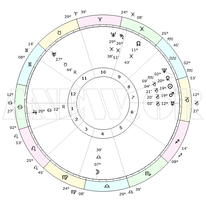 | | ΘΕΣΕΙΣ ΠΛΑΝΗΤΩΝ ΑΣΤΡΟΛΟΓΙΚΟΥ ΧΑΡΤΗ ΤΗΣ ΣΤΙΓΜΗΣ ΑΥΤΗΣ | | | | Πλανήτης | Ζώδιο | Μοίρες | Δεκαήμ. | Σε οίκο | Απόκλιση | | Ακμές των οίκων | | Ηλιος | Αιγόκερως | 18°36' | Δεύτερο | 4 | 22 S 09 | | 1ος | 28°16' | Παρθένος | | Σελήνη | Παρθένος | 28°25' | Τρίτο | 1 | 00 S 50 | | 2ος | 24°44' | Ζυγός | | Ερμής | Αιγόκερως | 10°52' | Δεύτερο | 4 | 24 S 20 | | 3ος | 25°06' | Σκορπιός | | Αφροδίτη | Αιγόκερως | 19°08' | Δεύτερο | 4 | 22 S 51 | | 4ος | 28°04' | Τοξότης | | Αρης | Αιγόκερως | 18°45' | Δεύτερο | 4 | 23 S 03 | | 5ος | 01°04' | Υδροχόος | | Δίας | Καρκίνος | 20°18'R | Τρίτο | 10 | 22 N 09 | | 6ος | 01°34' | Ιχθείς | | Κρόνος | Ιχθείς | 26°47' | Τρίτο | 6 | 03 S 20 | | 7ος | 28°16' | Ιχθείς | | Ουρανός | Ταύρος | 27°45'R | Τρίτο | 9 | 19 N 28 | | 8ος | 24°44' | Κριός | | Ποσειδώνας | Ιχθείς | 29°37' | Τρίτο | 7 | 01 S 22 | | 9ος | 25°06' | Ταύρος | | Πλούτωνας | Υδροχόος | 02°58' | Πρώτο | 5 | 23 S 10 | | 10ος | 28°04' | Δίδυμοι | | Β. Δεσμός | Ιχθείς | 11°45' | Δεύτερο | 6 | 07 S 09 | | 11ος | 01°04' | Λέων | | Ωροσκόπος | Παρθένος | 28°16' | Τρίτο | | | 12ος | 01°34' | Παρθένος | | Μεσουράνημα | Δίδυμοι | 28°04' | Τρίτο | | | |