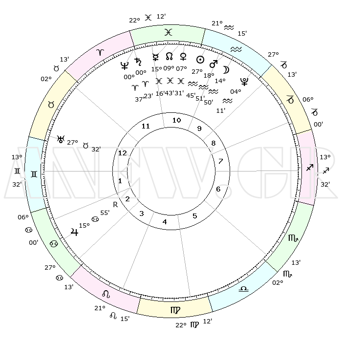 | | ΘΕΣΕΙΣ ΠΛΑΝΗΤΩΝ ΑΣΤΡΟΛΟΓΙΚΟΥ ΧΑΡΤΗ ΤΗΣ ΣΤΙΓΜΗΣ ΑΥΤΗΣ | | | | Πλανήτης | Ζώδιο | Μοίρες | Δεκαήμ. | Σε οίκο | Απόκλιση | | Ακμές των οίκων | | Ηλιος | Υδροχόος | 27°41' | Τρίτο | 11 | 12 S 17 | | 1ος | 14°45' | Ταύρος | | Σελήνη | Υδροχόος | 13°58' | Δεύτερο | 10 | 18 S 46 | | 2ος | 13°03' | Δίδυμοι | | Ερμής | Ιχθείς | 15°11' | Δεύτερο | 11 | 05 S 30 | | 3ος | 05°18' | Καρκίνος | | Αφροδίτη | Ιχθείς | 07°26' | Πρώτο | 11 | 10 S 08 | | 4ος | 27°15' | Καρκίνος | | Αρης | Υδροχόος | 18°48' | Δεύτερο | 10 | 16 S 13 | | 5ος | 23°22' | Λέων | | Δίας | Καρκίνος | 15°55'R | Δεύτερο | 3 | 22 N 49 | | 6ος | 29°02' | Παρθένος | | Κρόνος | Κριός | 00°23' | Πρώτο | 12 | 01 S 49 | | 7ος | 14°45' | Σκορπιός | | Ουρανός | Ταύρος | 27°31' | Τρίτο | 1 | 19 N 25 | | 8ος | 13°03' | Τοξότης | | Ποσειδώνας | Κριός | 00°37' | Πρώτο | 12 | 00 S 57 | | 9ος | 05°18' | Αιγόκερως | | Πλούτωνας | Υδροχόος | 04°11' | Πρώτο | 10 | 22 S 56 | | 10ος | 27°15' | Αιγόκερως | | Β. Δεσμός | Ιχθείς | 09°43' | Πρώτο | 11 | 07 S 56 | | 11ος | 23°22' | Υδροχόος | | Ωροσκόπος | Ταύρος | 14°45' | Δεύτερο | | | 12ος | 29°02' | Ιχθείς | | Μεσουράνημα | Αιγόκερως | 27°15' | Τρίτο | | | |
