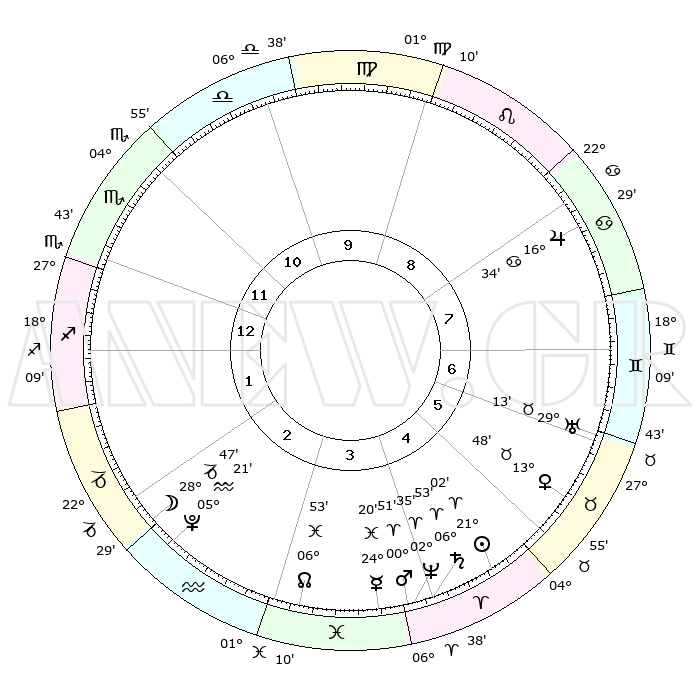 | | ΘΕΣΕΙΣ ΠΛΑΝΗΤΩΝ ΑΣΤΡΟΛΟΓΙΚΟΥ ΧΑΡΤΗ ΤΗΣ ΣΤΙΓΜΗΣ ΑΥΤΗΣ | | | | Πλανήτης | Ζώδιο | Μοίρες | Δεκαήμ. | Σε οίκο | Απόκλιση | | Ακμές των οίκων | | Ηλιος | Κριός | 20°57' | Τρίτο | 5 | 08 N 11 | | 1ος | 26°24' | Σκορπιός | | Σελήνη | Αιγόκερως | 27°53' | Τρίτο | 2 | 23 S 51 | | 2ος | 27°03' | Τοξότης | | Ερμής | Ιχθείς | 24°14' | Τρίτο | 4 | 04 S 29 | | 3ος | 02°11' | Υδροχόος | | Αφροδίτη | Ταύρος | 13°43' | Δεύτερο | 6 | 15 N 56 | | 4ος | 08°07' | Ιχθείς | | Αρης | Κριός | 00°48' | Πρώτο | 4 | 00 S 36 | | 5ος | 09°34' | Κριός | | Δίας | Καρκίνος | 16°33' | Δεύτερο | 8 | 22 N 47 | | 6ος | 05°06' | Ταύρος | | Κρόνος | Κριός | 06°53' | Πρώτο | 4 | 00 N 46 | | 7ος | 26°24' | Ταύρος | | Ουρανός | Ταύρος | 29°13' | Τρίτο | 7 | 19 N 49 | | 8ος | 27°03' | Δίδυμοι | | Ποσειδώνας | Κριός | 02°34' | Πρώτο | 4 | 00 S 11 | | 9ος | 02°11' | Λέων | | Πλούτωνας | Υδροχόος | 05°21' | Πρώτο | 3 | 22 S 47 | | 10ος | 08°07' | Παρθένος | | Β. Δεσμός | Ιχθείς | 06°53' | Πρώτο | 3 | 08 S 59 | | 11ος | 09°34' | Ζυγός | | Ωροσκόπος | Σκορπιός | 26°24' | Τρίτο | | | 12ος | 05°06' | Σκορπιός | | Μεσουράνημα | Παρθένος | 08°07' | Πρώτο | | | |