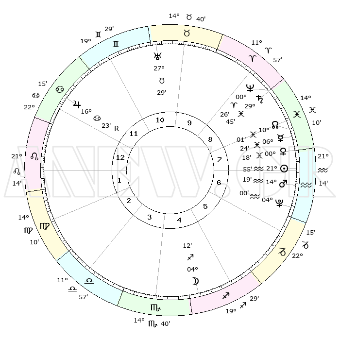 | | ΘΕΣΕΙΣ ΠΛΑΝΗΤΩΝ ΑΣΤΡΟΛΟΓΙΚΟΥ ΧΑΡΤΗ ΤΗΣ ΣΤΙΓΜΗΣ ΑΥΤΗΣ | | | | Πλανήτης | Ζώδιο | Μοίρες | Δεκαήμ. | Σε οίκο | Απόκλιση | | Ακμές των οίκων | | Ηλιος | Υδροχόος | 21°52' | Τρίτο | 7 | 14 S 13 | | 1ος | 07°21' | Λέων | | Σελήνη | Τοξότης | 03°38' | Πρώτο | 5 | 26 S 00 | | 2ος | 28°57' | Λέων | | Ερμής | Ιχθείς | 06°19' | Πρώτο | 8 | 09 S 56 | | 3ος | 25°00' | Παρθένος | | Αφροδίτη | Ιχθείς | 00°14' | Πρώτο | 8 | 12 S 45 | | 4ος | 26°50' | Ζυγός | | Αρης | Υδροχόος | 14°16' | Δεύτερο | 7 | 17 S 34 | | 5ος | 02°36' | Τοξότης | | Δίας | Καρκίνος | 16°23'R | Δεύτερο | 12 | 22 N 45 | | 6ος | 07°08' | Αιγόκερως | | Κρόνος | Ιχθείς | 29°45' | Τρίτο | 9 | 02 S 05 | | 7ος | 07°21' | Υδροχόος | | Ουρανός | Ταύρος | 27°29' | Τρίτο | 10 | 19 N 25 | | 8ος | 28°57' | Υδροχόος | | Ποσειδώνας | Κριός | 00°26' | Πρώτο | 9 | 01 S 02 | | 9ος | 25°00' | Ιχθείς | | Πλούτωνας | Υδροχόος | 04°00' | Πρώτο | 6 | 22 S 58 | | 10ος | 26°50' | Κριός | | Β. Δεσμός | Ιχθείς | 10°01' | Δεύτερο | 8 | 07 S 49 | | 11ος | 02°36' | Δίδυμοι | | Ωροσκόπος | Λέων | 07°21' | Πρώτο | | | 12ος | 07°08' | Καρκίνος | | Μεσουράνημα | Κριός | 26°50' | Τρίτο | | | |