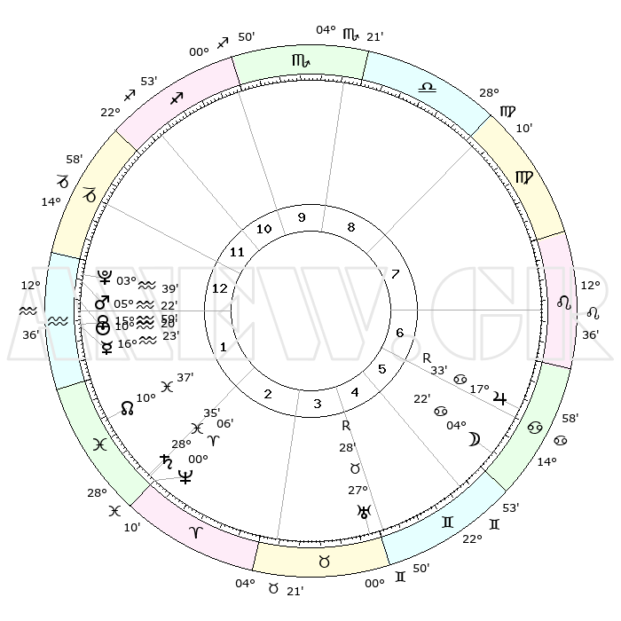 | | ΘΕΣΕΙΣ ΠΛΑΝΗΤΩΝ ΑΣΤΡΟΛΟΓΙΚΟΥ ΧΑΡΤΗ ΤΗΣ ΣΤΙΓΜΗΣ ΑΥΤΗΣ | | | | Πλανήτης | Ζώδιο | Μοίρες | Δεκαήμ. | Σε οίκο | Απόκλιση | | Ακμές των οίκων | | Ηλιος | Υδροχόος | 10°17' | Δεύτερο | 1 | 17 S 40 | | 1ος | 17°48' | Αιγόκερως | | Σελήνη | Καρκίνος | 03°31' | Πρώτο | 6 | 28 N 08 | | 2ος | 29°25' | Υδροχόος | | Ερμής | Υδροχόος | 16°17' | Δεύτερο | 1 | 17 S 50 | | 3ος | 09°21' | Κριός | | Αφροδίτη | Υδροχόος | 15°54' | Δεύτερο | 1 | 17 S 20 | | 4ος | 10°02' | Ταύρος | | Αρης | Υδροχόος | 05°19' | Πρώτο | 1 | 19 S 56 | | 5ος | 03°55' | Δίδυμοι | | Δίας | Καρκίνος | 17°34'R | Δεύτερο | 6 | 22 N 35 | | 6ος | 25°08' | Δίδυμοι | | Κρόνος | Ιχθείς | 28°35' | Τρίτο | 2 | 02 S 34 | | 7ος | 17°48' | Καρκίνος | | Ουρανός | Ταύρος | 27°28'R | Τρίτο | 4 | 19 N 24 | | 8ος | 29°25' | Λέων | | Ποσειδώνας | Κριός | 00°06' | Πρώτο | 2 | 01 S 10 | | 9ος | 09°21' | Ζυγός | | Πλούτωνας | Υδροχόος | 03°39' | Πρώτο | 1 | 23 S 02 | | 10ος | 10°02' | Σκορπιός | | Β. Δεσμός | Ιχθείς | 10°37' | Δεύτερο | 2 | 07 S 35 | | 11ος | 03°56' | Τοξότης | | Ωροσκόπος | Αιγόκερως | 17°48' | Δεύτερο | | | 12ος | 25°08' | Τοξότης | | Μεσουράνημα | Σκορπιός | 10°02' | Δεύτερο | | | |