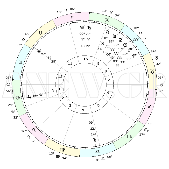 | | ΘΕΣΕΙΣ ΠΛΑΝΗΤΩΝ ΑΣΤΡΟΛΟΓΙΚΟΥ ΧΑΡΤΗ ΤΗΣ ΣΤΙΓΜΗΣ ΑΥΤΗΣ | | | | Πλανήτης | Ζώδιο | Μοίρες | Δεκαήμ. | Σε οίκο | Απόκλιση | | Ακμές των οίκων | | Ηλιος | Υδροχόος | 17°40' | Δεύτερο | 9 | 15 S 32 | | 1ος | 13°58' | Δίδυμοι | | Σελήνη | Ζυγός | 13°25' | Δεύτερο | 5 | 08 S 02 | | 2ος | 06°23' | Καρκίνος | | Ερμής | Υδροχόος | 29°09' | Τρίτο | 10 | 13 S 05 | | 3ος | 27°36' | Καρκίνος | | Αφροδίτη | Υδροχόος | 25°02' | Τρίτο | 10 | 14 S 31 | | 4ος | 21°41' | Λέων | | Αρης | Υδροχόος | 11°01' | Δεύτερο | 9 | 18 S 29 | | 5ος | 22°43' | Παρθένος | | Δίας | Καρκίνος | 16°47'R | Δεύτερο | 2 | 22 N 41 | | 6ος | 02°46' | Σκορπιός | | Κρόνος | Ιχθείς | 29°18' | Τρίτο | 11 | 02 S 16 | | 7ος | 13°58' | Τοξότης | | Ουρανός | Ταύρος | 27°28' | Τρίτο | 12 | 19 N 24 | | 8ος | 06°23' | Αιγόκερως | | Ποσειδώνας | Κριός | 00°18' | Πρώτο | 11 | 01 S 05 | | 9ος | 27°36' | Αιγόκερως | | Πλούτωνας | Υδροχόος | 03°52' | Πρώτο | 9 | 22 S 59 | | 10ος | 21°41' | Υδροχόος | | Β. Δεσμός | Ιχθείς | 10°14' | Δεύτερο | 10 | 07 S 44 | | 11ος | 22°43' | Ιχθείς | | Ωροσκόπος | Δίδυμοι | 13°58' | Δεύτερο | | | 12ος | 02°46' | Ταύρος | | Μεσουράνημα | Υδροχόος | 21°41' | Τρίτο | | | |