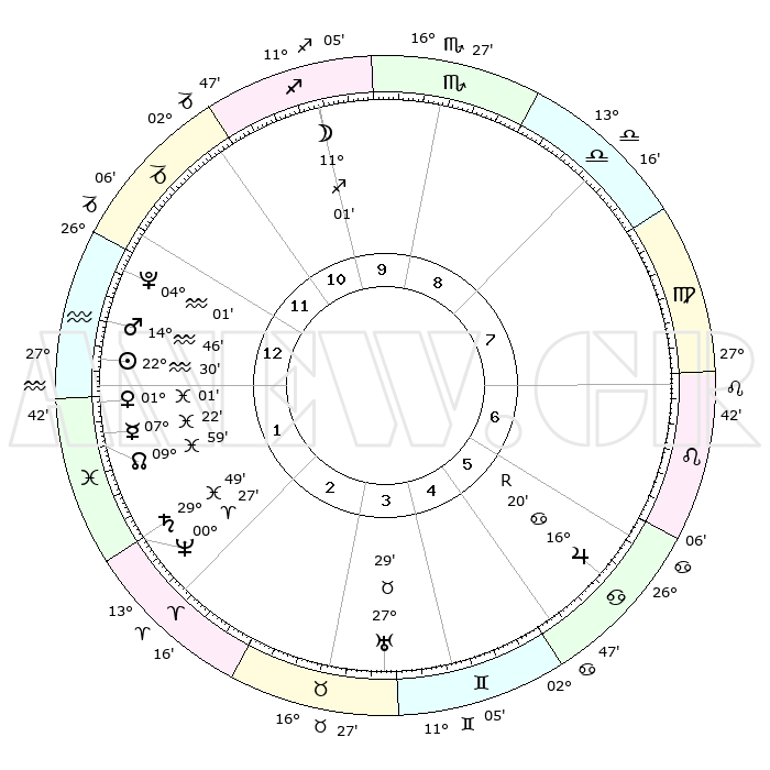 | | ΘΕΣΕΙΣ ΠΛΑΝΗΤΩΝ ΑΣΤΡΟΛΟΓΙΚΟΥ ΧΑΡΤΗ ΤΗΣ ΣΤΙΓΜΗΣ ΑΥΤΗΣ | | | | Πλανήτης | Ζώδιο | Μοίρες | Δεκαήμ. | Σε οίκο | Απόκλιση | | Ακμές των οίκων | | Ηλιος | Υδροχόος | 22°26' | Τρίτο | 1 | 14 S 02 | | 1ος | 25°14' | Αιγόκερως | | Σελήνη | Τοξότης | 10°11' | Δεύτερο | 11 | 27 S 10 | | 2ος | 08°28' | Ιχθείς | | Ερμής | Ιχθείς | 07°15' | Πρώτο | 1 | 09 S 30 | | 3ος | 17°36' | Κριός | | Αφροδίτη | Ιχθείς | 00°56' | Πρώτο | 1 | 12 S 30 | | 4ος | 16°55' | Ταύρος | | Αρης | Υδροχόος | 14°43' | Δεύτερο | 1 | 17 S 26 | | 5ος | 10°03' | Δίδυμοι | | Δίας | Καρκίνος | 16°20'R | Δεύτερο | 6 | 22 N 45 | | 6ος | 01°20' | Καρκίνος | | Κρόνος | Ιχθείς | 29°48' | Τρίτο | 2 | 02 S 03 | | 7ος | 25°14' | Καρκίνος | | Ουρανός | Ταύρος | 27°29' | Τρίτο | 4 | 19 N 25 | | 8ος | 08°28' | Παρθένος | | Ποσειδώνας | Κριός | 00°27' | Πρώτο | 2 | 01 S 02 | | 9ος | 17°36' | Ζυγός | | Πλούτωνας | Υδροχόος | 04°01' | Πρώτο | 1 | 22 S 58 | | 10ος | 16°55' | Σκορπιός | | Β. Δεσμός | Ιχθείς | 09°59' | Πρώτο | 2 | 07 S 49 | | 11ος | 10°03' | Τοξότης | | Ωροσκόπος | Αιγόκερως | 25°14' | Τρίτο | | | 12ος | 01°20' | Αιγόκερως | | Μεσουράνημα | Σκορπιός | 16°55' | Δεύτερο | | | |
