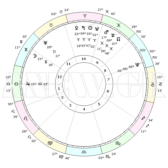 | | ΘΕΣΕΙΣ ΠΛΑΝΗΤΩΝ ΑΣΤΡΟΛΟΓΙΚΟΥ ΧΑΡΤΗ ΤΗΣ ΣΤΙΓΜΗΣ ΑΥΤΗΣ | | | | Πλανήτης | Ζώδιο | Μοίρες | Δεκαήμ. | Σε οίκο | Απόκλιση | | Ακμές των οίκων | | Ηλιος | Κριός | 03°44' | Πρώτο | 10 | 01 N 29 | | 1ος | 26°19' | Δίδυμοι | | Σελήνη | Δίδυμοι | 14°39' | Δεύτερο | 12 | 27 N 43 | | 2ος | 17°22' | Καρκίνος | | Ερμής | Ιχθείς | 09°05' | Πρώτο | 10 | 08 S 01 | | 3ος | 08°57' | Λέων | | Αφροδίτη | Κριός | 22°14' | Τρίτο | 11 | 07 N 58 | | 4ος | 04°42' | Παρθένος | | Αρης | Ιχθείς | 17°09' | Δεύτερο | 10 | 06 S 04 | | 5ος | 08°02' | Ζυγός | | Δίας | Καρκίνος | 15°22' | Δεύτερο | 1 | 22 N 55 | | 6ος | 18°14' | Σκορπιός | | Κρόνος | Κριός | 04°43' | Πρώτο | 10 | 00 S 05 | | 7ος | 26°19' | Τοξότης | | Ουρανός | Ταύρος | 28°27' | Τρίτο | 12 | 19 N 38 | | 8ος | 17°22' | Αιγόκερως | | Ποσειδώνας | Κριός | 01°55' | Πρώτο | 10 | 00 S 26 | | 9ος | 08°57' | Υδροχόος | | Πλούτωνας | Υδροχόος | 05°05' | Πρώτο | 8 | 22 S 48 | | 10ος | 04°42' | Ιχθείς | | Β. Δεσμός | Ιχθείς | 07°48' | Πρώτο | 10 | 08 S 38 | | 11ος | 08°02' | Κριός | | Ωροσκόπος | Δίδυμοι | 26°19' | Τρίτο | | | 12ος | 18°14' | Ταύρος | | Μεσουράνημα | Ιχθείς | 04°42' | Πρώτο | | | |