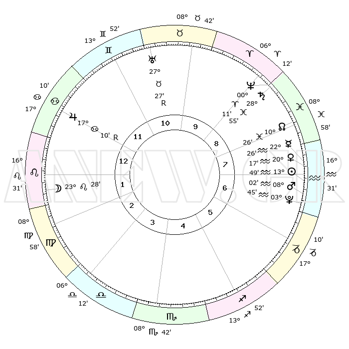 | | ΘΕΣΕΙΣ ΠΛΑΝΗΤΩΝ ΑΣΤΡΟΛΟΓΙΚΟΥ ΧΑΡΤΗ ΤΗΣ ΣΤΙΓΜΗΣ ΑΥΤΗΣ | | | | Πλανήτης | Ζώδιο | Μοίρες | Δεκαήμ. | Σε οίκο | Απόκλιση | | Ακμές των οίκων | | Ηλιος | Υδροχόος | 13°45' | Δεύτερο | 7 | 16 S 42 | | 1ος | 25°42' | Καρκίνος | | Σελήνη | Λέων | 22°28' | Τρίτο | 2 | 15 N 26 | | 2ος | 16°29' | Λέων | | Ερμής | Υδροχόος | 22°18' | Τρίτο | 8 | 15 S 45 | | 3ος | 10°57' | Παρθένος | | Αφροδίτη | Υδροχόος | 20°11' | Τρίτο | 8 | 16 S 04 | | 4ος | 11°25' | Ζυγός | | Αρης | Υδροχόος | 07°59' | Πρώτο | 7 | 19 S 17 | | 5ος | 17°31' | Σκορπιός | | Δίας | Καρκίνος | 17°11'R | Δεύτερο | 12 | 22 N 38 | | 6ος | 23°56' | Τοξότης | | Κρόνος | Ιχθείς | 28°55' | Τρίτο | 9 | 02 S 25 | | 7ος | 25°42' | Αιγόκερως | | Ουρανός | Ταύρος | 27°27'R | Τρίτο | 11 | 19 N 24 | | 8ος | 16°29' | Υδροχόος | | Ποσειδώνας | Κριός | 00°11' | Πρώτο | 9 | 01 S 08 | | 9ος | 10°57' | Ιχθείς | | Πλούτωνας | Υδροχόος | 03°45' | Πρώτο | 7 | 23 S 01 | | 10ος | 11°25' | Κριός | | Β. Δεσμός | Ιχθείς | 10°27' | Δεύτερο | 8 | 07 S 39 | | 11ος | 17°31' | Ταύρος | | Ωροσκόπος | Καρκίνος | 25°42' | Τρίτο | | | 12ος | 23°56' | Δίδυμοι | | Μεσουράνημα | Κριός | 11°25' | Δεύτερο | | | |