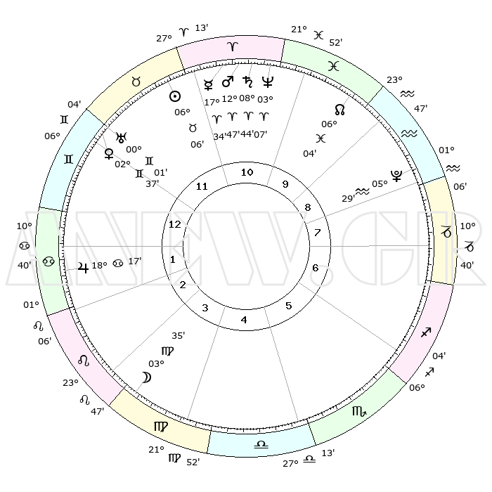 | | ΘΕΣΕΙΣ ΠΛΑΝΗΤΩΝ ΑΣΤΡΟΛΟΓΙΚΟΥ ΧΑΡΤΗ ΤΗΣ ΣΤΙΓΜΗΣ ΑΥΤΗΣ | | | | Πλανήτης | Ζώδιο | Μοίρες | Δεκαήμ. | Σε οίκο | Απόκλιση | | Ακμές των οίκων | | Ηλιος | Ταύρος | 06°03' | Πρώτο | 11 | 13 N 32 | | 1ος | 21°42' | Δίδυμοι | | Σελήνη | Παρθένος | 02°49' | Πρώτο | 4 | 10 N 50 | | 2ος | 13°10' | Καρκίνος | | Ερμής | Κριός | 17°28' | Δεύτερο | 11 | 04 N 41 | | 3ος | 04°33' | Λέων | | Αφροδίτη | Δίδυμοι | 02°33' | Πρώτο | 12 | 21 N 20 | | 4ος | 29°37' | Λέων | | Αρης | Κριός | 12°45' | Δεύτερο | 11 | 04 N 11 | | 5ος | 02°07' | Ζυγός | | Δίας | Καρκίνος | 18°17' | Δεύτερο | 2 | 22 N 34 | | 6ος | 12°25' | Σκορπιός | | Κρόνος | Κριός | 08°43' | Πρώτο | 11 | 01 N 28 | | 7ος | 21°42' | Τοξότης | | Ουρανός | Δίδυμοι | 00°01' | Πρώτο | 12 | 19 N 59 | | 8ος | 13°10' | Αιγόκερως | | Ποσειδώνας | Κριός | 03°07' | Πρώτο | 11 | 00 N 02 | | 9ος | 04°33' | Υδροχόος | | Πλούτωνας | Υδροχόος | 05°29' | Πρώτο | 9 | 22 S 48 | | 10ος | 29°37' | Υδροχόος | | Β. Δεσμός | Ιχθείς | 06°04' | Πρώτο | 10 | 09 S 17 | | 11ος | 02°07' | Κριός | | Ωροσκόπος | Δίδυμοι | 21°42' | Τρίτο | | | 12ος | 12°25' | Ταύρος | | Μεσουράνημα | Υδροχόος | 29°37' | Τρίτο | | | |