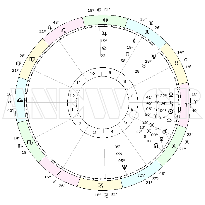 | | ΘΕΣΕΙΣ ΠΛΑΝΗΤΩΝ ΑΣΤΡΟΛΟΓΙΚΟΥ ΧΑΡΤΗ ΤΗΣ ΣΤΙΓΜΗΣ ΑΥΤΗΣ | | | | Πλανήτης | Ζώδιο | Μοίρες | Δεκαήμ. | Σε οίκο | Απόκλιση | | Ακμές των οίκων | | Ηλιος | Κριός | 04°01' | Πρώτο | 7 | 01 N 36 | | 1ος | 25°35' | Παρθένος | | Σελήνη | Δίδυμοι | 18°57' | Δεύτερο | 9 | 28 N 06 | | 2ος | 21°51' | Ζυγός | | Ερμής | Ιχθείς | 09°11' | Πρώτο | 6 | 08 S 03 | | 3ος | 22°06' | Σκορπιός | | Αφροδίτη | Κριός | 22°36' | Τρίτο | 8 | 08 N 07 | | 4ος | 25°03' | Τοξότης | | Αρης | Ιχθείς | 17°23' | Δεύτερο | 6 | 05 S 58 | | 5ος | 28°05' | Αιγόκερως | | Δίας | Καρκίνος | 15°23' | Δεύτερο | 10 | 22 N 55 | | 6ος | 28°41' | Υδροχόος | | Κρόνος | Κριός | 04°45' | Πρώτο | 7 | 00 S 04 | | 7ος | 25°35' | Ιχθείς | | Ουρανός | Ταύρος | 28°28' | Τρίτο | 9 | 19 N 39 | | 8ος | 21°51' | Κριός | | Ποσειδώνας | Κριός | 01°56' | Πρώτο | 7 | 00 S 26 | | 9ος | 22°06' | Ταύρος | | Πλούτωνας | Υδροχόος | 05°05' | Πρώτο | 5 | 22 S 48 | | 10ος | 25°03' | Δίδυμοι | | Β. Δεσμός | Ιχθείς | 07°48' | Πρώτο | 6 | 08 S 39 | | 11ος | 28°05' | Καρκίνος | | Ωροσκόπος | Παρθένος | 25°35' | Τρίτο | | | 12ος | 28°41' | Λέων | | Μεσουράνημα | Δίδυμοι | 25°03' | Τρίτο | | | |