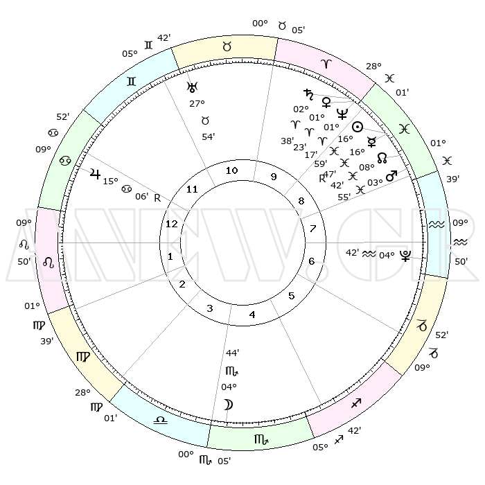 | | ΘΕΣΕΙΣ ΠΛΑΝΗΤΩΝ ΑΣΤΡΟΛΟΓΙΚΟΥ ΧΑΡΤΗ ΤΗΣ ΣΤΙΓΜΗΣ ΑΥΤΗΣ | | | | Πλανήτης | Ζώδιο | Μοίρες | Δεκαήμ. | Σε οίκο | Απόκλιση | | Ακμές των οίκων | | Ηλιος | Ιχθείς | 16°55' | Δεύτερο | 9 | 05 S 10 | | 1ος | 23°36' | Καρκίνος | | Σελήνη | Σκορπιός | 04°03' | Πρώτο | 4 | 16 S 56 | | 2ος | 14°16' | Λέων | | Ερμής | Ιχθείς | 16°51'R | Δεύτερο | 9 | 01 S 50 | | 3ος | 08°28' | Παρθένος | | Αφροδίτη | Κριός | 01°19' | Πρώτο | 9 | 00 S 37 | | 4ος | 08°38' | Ζυγός | | Αρης | Ιχθείς | 03°52' | Πρώτο | 8 | 11 S 06 | | 5ος | 14°43' | Σκορπιός | | Δίας | Καρκίνος | 15°06'R | Δεύτερο | 12 | 22 N 56 | | 6ος | 21°30' | Τοξότης | | Κρόνος | Κριός | 02°37' | Πρώτο | 9 | 00 S 55 | | 7ος | 23°36' | Αιγόκερως | | Ουρανός | Ταύρος | 27°53' | Τρίτο | 11 | 19 N 31 | | 8ος | 14°16' | Υδροχόος | | Ποσειδώνας | Κριός | 01°17' | Πρώτο | 9 | 00 S 41 | | 9ος | 08°28' | Ιχθείς | | Πλούτωνας | Υδροχόος | 04°42' | Πρώτο | 7 | 22 S 51 | | 10ος | 08°38' | Κριός | | Β. Δεσμός | Ιχθείς | 08°42' | Πρώτο | 9 | 08 S 18 | | 11ος | 14°43' | Ταύρος | | Ωροσκόπος | Καρκίνος | 23°36' | Τρίτο | | | 12ος | 21°30' | Δίδυμοι | | Μεσουράνημα | Κριός | 08°38' | Πρώτο | | | |