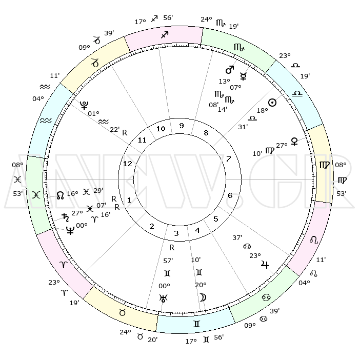 | ΘΕΣΕΙΣ ΠΛΑΝΗΤΩΝ ΑΣΤΡΟΛΟΓΙΚΟΥ ΧΑΡΤΗ ΤΗΣ ΣΤΙΓΜΗΣ ΑΥΤΗΣ | | Πλανήτης | Ζώδιο | Μοίρες | Δεκαήμ. | Σε οίκο | Απόκλιση | | Ακμές των οίκων | Ηλιος | Ζυγός | 18°19' | Δεύτερο | 10 | 07 S 11 | | 1ος | 17°09' | Τοξότης | Σελήνη | Δίδυμοι | 17°16' | Δεύτερο | 7 | 28 N 01 | | 2ος | 21°18' | Αιγόκερως | Ερμής | Σκορπιός | 06°57' | Πρώτο | 11 | 15 S 05 | | 3ος | 29°50' | Υδροχόος | Αφροδίτη | Παρθένος | 26°55' | Τρίτο | 9 | 02 N 35 | | 4ος | 05°23' | Κριός | Αρης | Σκορπιός | 13°00' | Δεύτερο | 11 | 15 S 55 | | 5ος | 03°49' | Ταύρος | Δίας | Καρκίνος | 23°36' | Τρίτο | 8 | 21 N 25 | | 6ος | 26°44' | Ταύρος | Κρόνος | Ιχθείς | 27°08'R | Τρίτο | 3 | 03 S 26 | | 7ος | 17°09' | Δίδυμοι | Ουρανός | Δίδυμοι | 00°57'R | Πρώτο | 6 | 20 N 08 | | 8ος | 21°18' | Καρκίνος | Ποσειδώνας | Κριός | 00°16'R | Πρώτο | 3 | 01 S 09 | | 9ος | 29°50' | Λέων | Πλούτωνας | Υδροχόος | 01°22'R | Πρώτο | 2 | 23 S 32 | | 10ος | 05°23' | Ζυγός | Β. Δεσμός | Ιχθείς | 16°29' | Δεύτερο | 3 | 05 S 20 | | 11ος | 03°49' | Σκορπιός | Ωροσκόπος | Τοξότης | 17°09' | Δεύτερο | | | 12ος | 26°44' | Σκορπιός | Μεσουράνημα | Ζυγός | 05°23' | Πρώτο | | | |