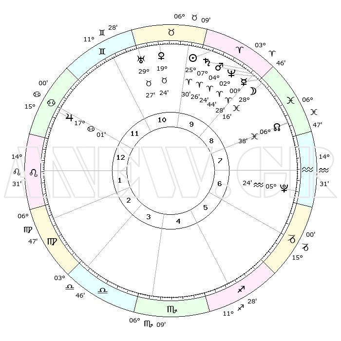 | | ΘΕΣΕΙΣ ΠΛΑΝΗΤΩΝ ΑΣΤΡΟΛΟΓΙΚΟΥ ΧΑΡΤΗ ΤΗΣ ΣΤΙΓΜΗΣ ΑΥΤΗΣ | | | | Πλανήτης | Ζώδιο | Μοίρες | Δεκαήμ. | Σε οίκο | Απόκλιση | | Ακμές των οίκων | | Ηλιος | Κριός | 25°26' | Τρίτο | 10 | 09 N 50 | | 1ος | 22°51' | Καρκίνος | | Σελήνη | Ιχθείς | 27°13' | Τρίτο | 9 | 00 N 27 | | 2ος | 13°29' | Λέων | | Ερμής | Κριός | 00°22' | Πρώτο | 9 | 02 S 15 | | 3ος | 07°35' | Παρθένος | | Αφροδίτη | Ταύρος | 19°18' | Δεύτερο | 11 | 17 N 44 | | 4ος | 07°38' | Ζυγός | | Αρης | Κριός | 04°20' | Πρώτο | 9 | 00 N 49 | | 5ος | 13°42' | Σκορπιός | | Δίας | Καρκίνος | 17°00' | Δεύτερο | 12 | 22 N 44 | | 6ος | 20°37' | Τοξότης | | Κρόνος | Κριός | 07°26' | Πρώτο | 9 | 00 N 59 | | 7ος | 22°51' | Αιγόκερως | | Ουρανός | Ταύρος | 29°27' | Τρίτο | 11 | 19 N 52 | | 8ος | 13°29' | Υδροχόος | | Ποσειδώνας | Κριός | 02°44' | Πρώτο | 9 | 00 S 07 | | 9ος | 07°35' | Ιχθείς | | Πλούτωνας | Υδροχόος | 05°24' | Πρώτο | 7 | 22 S 47 | | 10ος | 07°38' | Κριός | | Β. Δεσμός | Ιχθείς | 06°38' | Πρώτο | 8 | 09 S 04 | | 11ος | 13°42' | Ταύρος | | Ωροσκόπος | Καρκίνος | 22°51' | Τρίτο | | | 12ος | 20°37' | Δίδυμοι | | Μεσουράνημα | Κριός | 07°38' | Πρώτο | | | |
