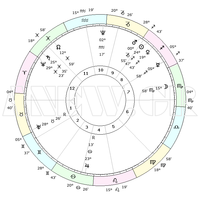 | | ΘΕΣΕΙΣ ΠΛΑΝΗΤΩΝ ΑΣΤΡΟΛΟΓΙΚΟΥ ΧΑΡΤΗ ΤΗΣ ΣΤΙΓΜΗΣ ΑΥΤΗΣ | | | | Πλανήτης | Ζώδιο | Μοίρες | Δεκαήμ. | Σε οίκο | Απόκλιση | | Ακμές των οίκων | | Ηλιος | Τοξότης | 24°27' | Τρίτο | 1 | 23 S 19 | | 1ος | 06°34' | Τοξότης | | Σελήνη | Σκορπιός | 12°02' | Δεύτερο | 11 | 19 S 32 | | 2ος | 08°42' | Αιγόκερως | | Ερμής | Τοξότης | 05°31' | Πρώτο | 12 | 19 S 51 | | 3ος | 15°31' | Υδροχόος | | Αφροδίτη | Τοξότης | 19°18' | Δεύτερο | 1 | 22 S 53 | | 4ος | 21°35' | Ιχθείς | | Αρης | Αιγόκερως | 00°40' | Πρώτο | 1 | 24 S 13 | | 5ος | 21°44' | Κριός | | Δίας | Καρκίνος | 23°15'R | Τρίτο | 8 | 21 N 38 | | 6ος | 15°54' | Ταύρος | | Κρόνος | Ιχθείς | 25°34' | Τρίτο | 4 | 03 S 53 | | 7ος | 06°34' | Δίδυμοι | | Ουρανός | Ταύρος | 28°27'R | Τρίτο | 6 | 19 N 37 | | 8ος | 08°42' | Καρκίνος | | Ποσειδώνας | Ιχθείς | 29°23' | Τρίτο | 4 | 01 S 29 | | 9ος | 15°31' | Λέων | | Πλούτωνας | Υδροχόος | 02°16' | Πρώτο | 2 | 23 S 19 | | 10ος | 21°35' | Παρθένος | | Β. Δεσμός | Ιχθείς | 13°00' | Δεύτερο | 3 | 06 S 40 | | 11ος | 21°44' | Ζυγός | | Ωροσκόπος | Τοξότης | 06°34' | Πρώτο | | | 12ος | 15°54' | Σκορπιός | | Μεσουράνημα | Παρθένος | 21°35' | Τρίτο | | | |