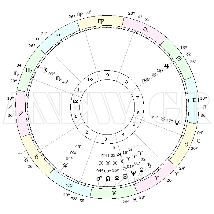 | | ΘΕΣΕΙΣ ΠΛΑΝΗΤΩΝ ΑΣΤΡΟΛΟΓΙΚΟΥ ΧΑΡΤΗ ΤΗΣ ΣΤΙΓΜΗΣ ΑΥΤΗΣ | | | | Πλανήτης | Ζώδιο | Μοίρες | Δεκαήμ. | Σε οίκο | Απόκλιση | | Ακμές των οίκων | | Ηλιος | Ιχθείς | 17°20' | Δεύτερο | 4 | 05 S 00 | | 1ος | 20°49' | Σκορπιός | | Σελήνη | Σκορπιός | 08°57' | Πρώτο | 12 | 18 S 48 | | 2ος | 20°51' | Τοξότης | | Ερμής | Ιχθείς | 16°26'R | Δεύτερο | 4 | 02 S 01 | | 3ος | 25°07' | Αιγόκερως | | Αφροδίτη | Κριός | 01°49' | Πρώτο | 4 | 00 S 24 | | 4ος | 00°46' | Ιχθείς | | Αρης | Ιχθείς | 04°11' | Πρώτο | 4 | 10 S 59 | | 5ος | 02°46' | Κριός | | Δίας | Καρκίνος | 15°06'R | Δεύτερο | 8 | 22 N 56 | | 6ος | 29°04' | Κριός | | Κρόνος | Κριός | 02°40' | Πρώτο | 4 | 00 S 53 | | 7ος | 20°49' | Ταύρος | | Ουρανός | Ταύρος | 27°54' | Τρίτο | 7 | 19 N 31 | | 8ος | 20°51' | Δίδυμοι | | Ποσειδώνας | Κριός | 01°18' | Πρώτο | 4 | 00 S 41 | | 9ος | 25°07' | Καρκίνος | | Πλούτωνας | Υδροχόος | 04°43' | Πρώτο | 3 | 22 S 51 | | 10ος | 00°46' | Παρθένος | | Β. Δεσμός | Ιχθείς | 08°41' | Πρώτο | 4 | 08 S 19 | | 11ος | 02°46' | Ζυγός | | Ωροσκόπος | Σκορπιός | 20°49' | Τρίτο | | | 12ος | 29°04' | Ζυγός | | Μεσουράνημα | Παρθένος | 00°46' | Πρώτο | | | |