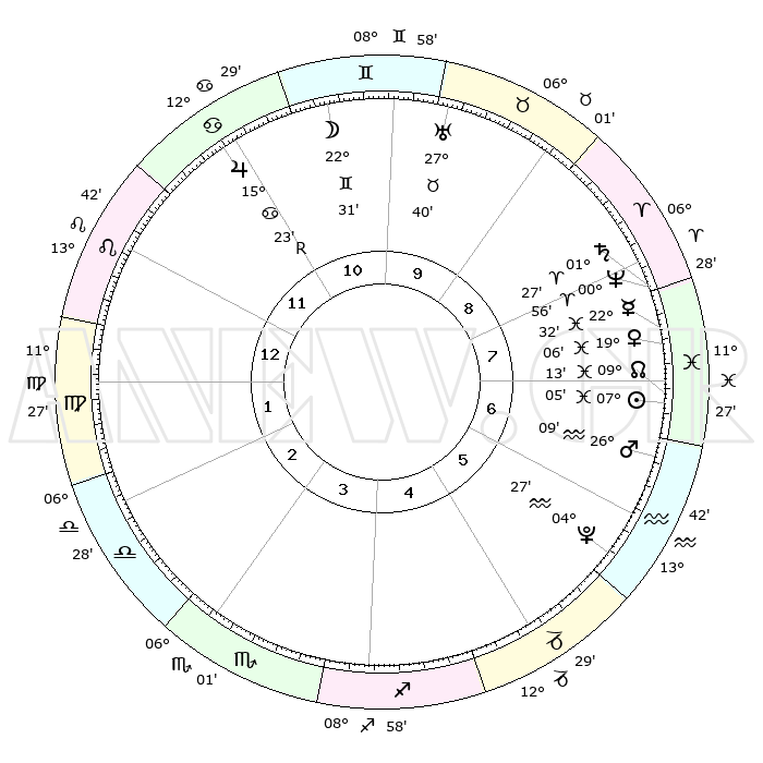 | | ΘΕΣΕΙΣ ΠΛΑΝΗΤΩΝ ΑΣΤΡΟΛΟΓΙΚΟΥ ΧΑΡΤΗ ΤΗΣ ΣΤΙΓΜΗΣ ΑΥΤΗΣ | | | | Πλανήτης | Ζώδιο | Μοίρες | Δεκαήμ. | Σε οίκο | Απόκλιση | | Ακμές των οίκων | | Ηλιος | Ιχθείς | 07°00' | Πρώτο | 7 | 08 S 56 | | 1ος | 19°37' | Λέων | | Σελήνη | Δίδυμοι | 21°27' | Τρίτο | 11 | 28 N 18 | | 2ος | 12°23' | Παρθένος | | Ερμής | Ιχθείς | 22°32' | Τρίτο | 8 | 00 S 32 | | 3ος | 09°59' | Ζυγός | | Αφροδίτη | Ιχθείς | 19°00' | Δεύτερο | 8 | 05 S 39 | | 4ος | 12°38' | Σκορπιός | | Αρης | Υδροχόος | 26°05' | Τρίτο | 7 | 13 S 51 | | 5ος | 17°34' | Τοξότης | | Δίας | Καρκίνος | 15°23'R | Δεύτερο | 11 | 22 N 53 | | 6ος | 20°31' | Αιγόκερως | | Κρόνος | Κριός | 01°26' | Πρώτο | 8 | 01 S 23 | | 7ος | 19°37' | Υδροχόος | | Ουρανός | Ταύρος | 27°40' | Τρίτο | 10 | 19 N 27 | | 8ος | 12°23' | Ιχθείς | | Ποσειδώνας | Κριός | 00°56' | Πρώτο | 8 | 00 S 50 | | 9ος | 09°59' | Κριός | | Πλούτωνας | Υδροχόος | 04°27' | Πρώτο | 6 | 22 S 53 | | 10ος | 12°38' | Ταύρος | | Β. Δεσμός | Ιχθείς | 09°13' | Πρώτο | 7 | 08 S 07 | | 11ος | 17°34' | Δίδυμοι | | Ωροσκόπος | Λέων | 19°37' | Δεύτερο | | | 12ος | 20°31' | Καρκίνος | | Μεσουράνημα | Ταύρος | 12°38' | Δεύτερο | | | |