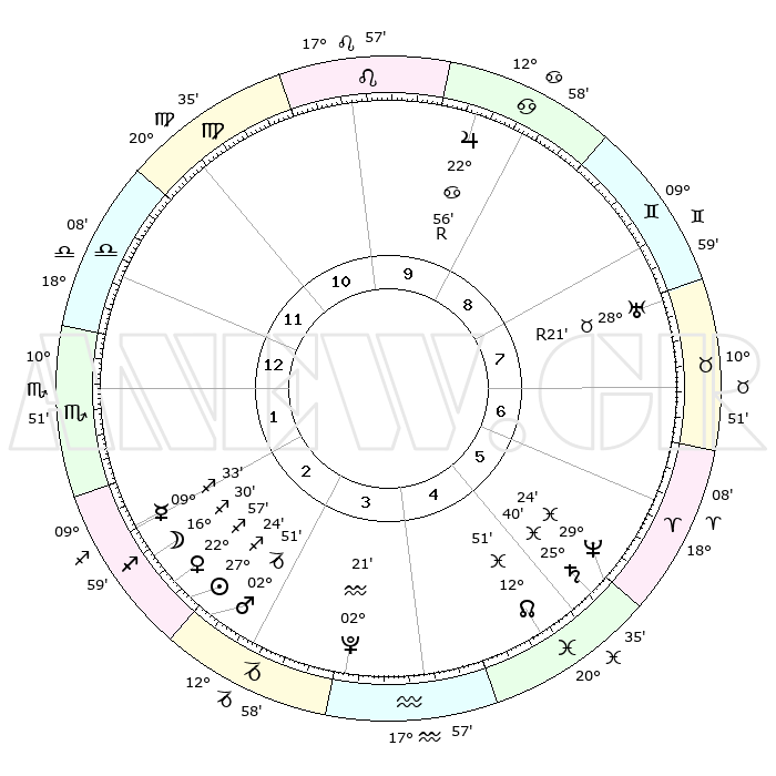 | | ΘΕΣΕΙΣ ΠΛΑΝΗΤΩΝ ΑΣΤΡΟΛΟΓΙΚΟΥ ΧΑΡΤΗ ΤΗΣ ΣΤΙΓΜΗΣ ΑΥΤΗΣ | | | | Πλανήτης | Ζώδιο | Μοίρες | Δεκαήμ. | Σε οίκο | Απόκλιση | | Ακμές των οίκων | | Ηλιος | Τοξότης | 27°00' | Τρίτο | 6 | 23 S 24 | | 1ος | 13°51' | Καρκίνος | | Σελήνη | Τοξότης | 11°44' | Δεύτερο | 6 | 27 S 08 | | 2ος | 04°16' | Λέων | | Ερμής | Τοξότης | 08°59' | Πρώτο | 5 | 20 S 44 | | 3ος | 27°18' | Λέων | | Αφροδίτη | Τοξότης | 22°27' | Τρίτο | 6 | 23 S 12 | | 4ος | 25°54' | Παρθένος | | Αρης | Αιγόκερως | 02°33' | Πρώτο | 6 | 24 S 13 | | 5ος | 01°32' | Σκορπιός | | Δίας | Καρκίνος | 22°58'R | Τρίτο | 1 | 21 N 41 | | 6ος | 09°55' | Τοξότης | | Κρόνος | Ιχθείς | 25°39' | Τρίτο | 9 | 03 S 51 | | 7ος | 13°51' | Αιγόκερως | | Ουρανός | Ταύρος | 28°22'R | Τρίτο | 11 | 19 N 36 | | 8ος | 04°16' | Υδροχόος | | Ποσειδώνας | Ιχθείς | 29°24' | Τρίτο | 10 | 01 S 28 | | 9ος | 27°18' | Υδροχόος | | Πλούτωνας | Υδροχόος | 02°20' | Πρώτο | 7 | 23 S 18 | | 10ος | 25°54' | Ιχθείς | | Β. Δεσμός | Ιχθείς | 12°53' | Δεύτερο | 9 | 06 S 44 | | 11ος | 01°32' | Ταύρος | | Ωροσκόπος | Καρκίνος | 13°51' | Δεύτερο | | | 12ος | 09°55' | Δίδυμοι | | Μεσουράνημα | Ιχθείς | 25°54' | Τρίτο | | | |