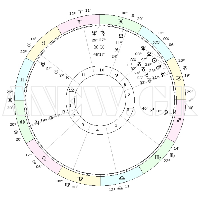 | | ΘΕΣΕΙΣ ΠΛΑΝΗΤΩΝ ΑΣΤΡΟΛΟΓΙΚΟΥ ΧΑΡΤΗ ΤΗΣ ΣΤΙΓΜΗΣ ΑΥΤΗΣ | | | | Πλανήτης | Ζώδιο | Μοίρες | Δεκαήμ. | Σε οίκο | Απόκλιση | | Ακμές των οίκων | | Ηλιος | Αιγόκερως | 25°20' | Τρίτο | 9 | 21 S 04 | | 1ος | 01°44' | Δίδυμοι | | Σελήνη | Τοξότης | 17°53' | Δεύτερο | 7 | 27 S 56 | | 2ος | 26°12' | Δίδυμοι | | Ερμής | Αιγόκερως | 21°26' | Τρίτο | 9 | 23 S 31 | | 3ος | 17°33' | Καρκίνος | | Αφροδίτη | Αιγόκερως | 27°26' | Τρίτο | 9 | 21 S 38 | | 4ος | 10°27' | Λέων | | Αρης | Αιγόκερως | 23°52' | Τρίτο | 9 | 22 S 17 | | 5ος | 09°13' | Παρθένος | | Δίας | Καρκίνος | 19°25'R | Δεύτερο | 3 | 22 N 18 | | 6ος | 17°55' | Ζυγός | | Κρόνος | Ιχθείς | 27°17' | Τρίτο | 11 | 03 S 07 | | 7ος | 01°44' | Τοξότης | | Ουρανός | Ταύρος | 27°37'R | Τρίτο | 12 | 19 N 26 | | 8ος | 26°12' | Τοξότης | | Ποσειδώνας | Ιχθείς | 29°45' | Τρίτο | 11 | 01 S 19 | | 9ος | 17°33' | Αιγόκερως | | Πλούτωνας | Υδροχόος | 03°10' | Πρώτο | 9 | 23 S 08 | | 10ος | 10°27' | Υδροχόος | | Β. Δεσμός | Ιχθείς | 11°24' | Δεύτερο | 11 | 07 S 17 | | 11ος | 09°13' | Ιχθείς | | Ωροσκόπος | Δίδυμοι | 01°44' | Πρώτο | | | 12ος | 17°55' | Κριός | | Μεσουράνημα | Υδροχόος | 10°27' | Δεύτερο | | | |