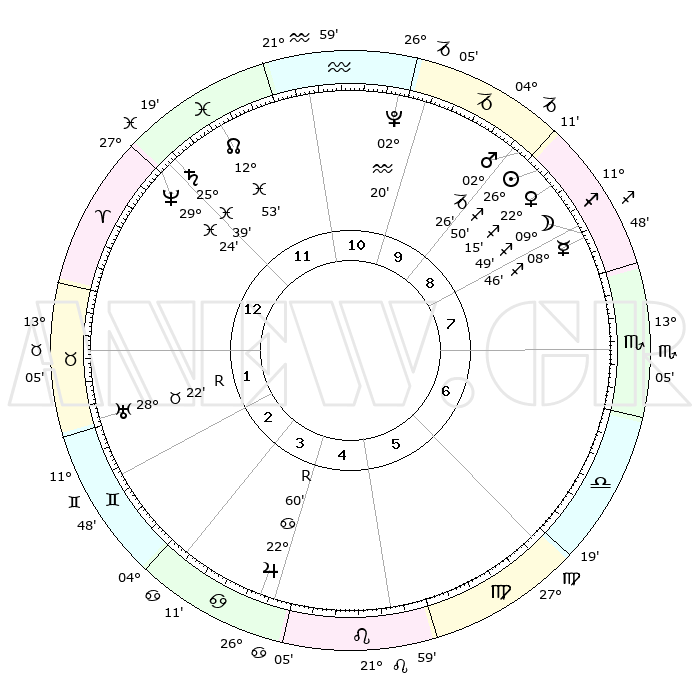 | | ΘΕΣΕΙΣ ΠΛΑΝΗΤΩΝ ΑΣΤΡΟΛΟΓΙΚΟΥ ΧΑΡΤΗ ΤΗΣ ΣΤΙΓΜΗΣ ΑΥΤΗΣ | | | | Πλανήτης | Ζώδιο | Μοίρες | Δεκαήμ. | Σε οίκο | Απόκλιση | | Ακμές των οίκων | | Ηλιος | Τοξότης | 26°27' | Τρίτο | 1 | 23 S 23 | | 1ος | 26°58' | Σκορπιός | | Σελήνη | Τοξότης | 05°17' | Πρώτο | 1 | 26 S 03 | | 2ος | 27°41' | Τοξότης | | Ερμής | Τοξότης | 08°14' | Πρώτο | 1 | 20 S 33 | | 3ος | 02°54' | Υδροχόος | | Αφροδίτη | Τοξότης | 21°46' | Τρίτο | 1 | 23 S 08 | | 4ος | 08°51' | Ιχθείς | | Αρης | Αιγόκερως | 02°09' | Πρώτο | 2 | 24 S 13 | | 5ος | 10°15' | Κριός | | Δίας | Καρκίνος | 23°02'R | Τρίτο | 8 | 21 N 40 | | 6ος | 05°42' | Ταύρος | | Κρόνος | Ιχθείς | 25°38' | Τρίτο | 4 | 03 S 51 | | 7ος | 26°58' | Ταύρος | | Ουρανός | Ταύρος | 28°23'R | Τρίτο | 7 | 19 N 36 | | 8ος | 27°41' | Δίδυμοι | | Ποσειδώνας | Ιχθείς | 29°23' | Τρίτο | 4 | 01 S 28 | | 9ος | 02°54' | Λέων | | Πλούτωνας | Υδροχόος | 02°19' | Πρώτο | 2 | 23 S 18 | | 10ος | 08°51' | Παρθένος | | Β. Δεσμός | Ιχθείς | 12°54' | Δεύτερο | 4 | 06 S 43 | | 11ος | 10°15' | Ζυγός | | Ωροσκόπος | Σκορπιός | 26°58' | Τρίτο | | | 12ος | 05°42' | Σκορπιός | | Μεσουράνημα | Παρθένος | 08°51' | Πρώτο | | | |