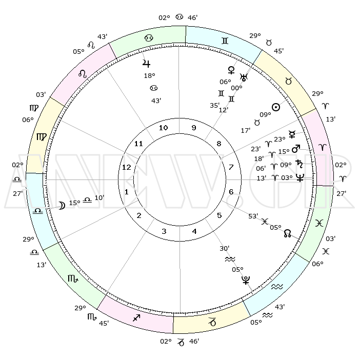 | | ΘΕΣΕΙΣ ΠΛΑΝΗΤΩΝ ΑΣΤΡΟΛΟΓΙΚΟΥ ΧΑΡΤΗ ΤΗΣ ΣΤΙΓΜΗΣ ΑΥΤΗΣ | | | | Πλανήτης | Ζώδιο | Μοίρες | Δεκαήμ. | Σε οίκο | Απόκλιση | | Ακμές των οίκων | | Ηλιος | Ταύρος | 09°14' | Πρώτο | 8 | 14 N 34 | | 1ος | 17°06' | Παρθένος | | Σελήνη | Ζυγός | 14°31' | Δεύτερο | 2 | 08 S 33 | | 2ος | 12°39' | Ζυγός | | Ερμής | Κριός | 23°17' | Τρίτο | 8 | 07 N 07 | | 3ος | 12°31' | Σκορπιός | | Αφροδίτη | Δίδυμοι | 06°32' | Πρώτο | 9 | 22 N 13 | | 4ος | 15°27' | Τοξότης | | Αρης | Κριός | 15°16' | Δεύτερο | 8 | 05 N 11 | | 5ος | 18°44' | Αιγόκερως | | Δίας | Καρκίνος | 18°43' | Δεύτερο | 10 | 22 N 31 | | 6ος | 19°41' | Υδροχόος | | Κρόνος | Κριός | 09°06' | Πρώτο | 7 | 01 N 37 | | 7ος | 17°06' | Ιχθείς | | Ουρανός | Δίδυμοι | 00°12' | Πρώτο | 9 | 20 N 01 | | 8ος | 12°39' | Κριός | | Ποσειδώνας | Κριός | 03°13' | Πρώτο | 7 | 00 N 04 | | 9ος | 12°31' | Ταύρος | | Πλούτωνας | Υδροχόος | 05°30' | Πρώτο | 5 | 22 S 49 | | 10ος | 15°27' | Δίδυμοι | | Β. Δεσμός | Ιχθείς | 05°54' | Πρώτο | 6 | 09 S 21 | | 11ος | 18°44' | Καρκίνος | | Ωροσκόπος | Παρθένος | 17°06' | Δεύτερο | | | 12ος | 19°41' | Λέων | | Μεσουράνημα | Δίδυμοι | 15°27' | Δεύτερο | | | |