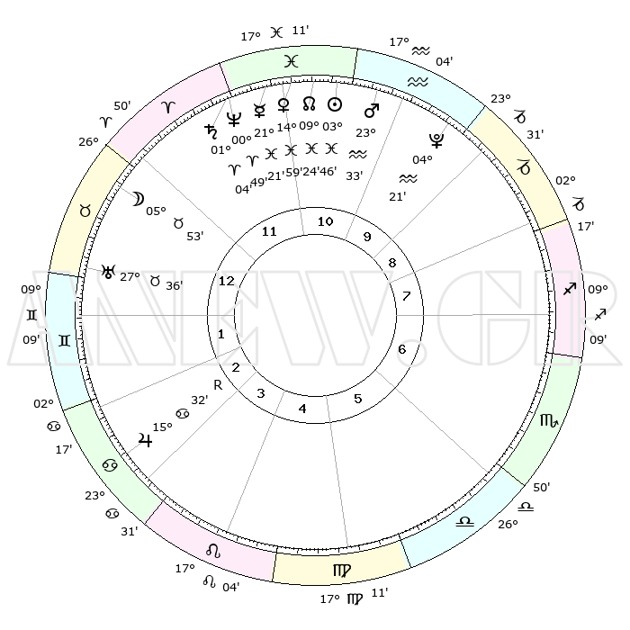| | ΘΕΣΕΙΣ ΠΛΑΝΗΤΩΝ ΑΣΤΡΟΛΟΓΙΚΟΥ ΧΑΡΤΗ ΤΗΣ ΣΤΙΓΜΗΣ ΑΥΤΗΣ | | | | Πλανήτης | Ζώδιο | Μοίρες | Δεκαήμ. | Σε οίκο | Απόκλιση | | Ακμές των οίκων | | Ηλιος | Ιχθείς | 03°42' | Πρώτο | 11 | 10 S 09 | | 1ος | 05°32' | Ταύρος | | Σελήνη | Ταύρος | 04°50' | Πρώτο | 12 | 17 N 15 | | 2ος | 06°14' | Δίδυμοι | | Ερμής | Ιχθείς | 21°18' | Τρίτο | 12 | 01 S 45 | | 3ος | 29°15' | Δίδυμοι | | Αφροδίτη | Ιχθείς | 14°54' | Δεύτερο | 11 | 07 S 16 | | 4ος | 20°60' | Καρκίνος | | Αρης | Υδροχόος | 23°30' | Τρίτο | 11 | 14 S 43 | | 5ος | 15°58' | Λέων | | Δίας | Καρκίνος | 15°33'R | Δεύτερο | 3 | 22 N 52 | | 6ος | 19°47' | Παρθένος | | Κρόνος | Κριός | 01°03' | Πρώτο | 12 | 01 S 33 | | 7ος | 05°32' | Σκορπιός | | Ουρανός | Ταύρος | 27°36' | Τρίτο | 1 | 19 N 27 | | 8ος | 06°14' | Τοξότης | | Ποσειδώνας | Κριός | 00°49' | Πρώτο | 12 | 00 S 53 | | 9ος | 29°15' | Τοξότης | | Πλούτωνας | Υδροχόος | 04°21' | Πρώτο | 10 | 22 S 54 | | 10ος | 20°60' | Αιγόκερως | | Β. Δεσμός | Ιχθείς | 09°24' | Πρώτο | 11 | 08 S 03 | | 11ος | 15°58' | Υδροχόος | | Ωροσκόπος | Ταύρος | 05°32' | Πρώτο | | | 12ος | 19°47' | Ιχθείς | | Μεσουράνημα | Αιγόκερως | 20°60' | Τρίτο | | | |
