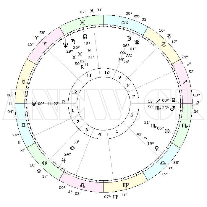 | | ΘΕΣΕΙΣ ΠΛΑΝΗΤΩΝ ΑΣΤΡΟΛΟΓΙΚΟΥ ΧΑΡΤΗ ΤΗΣ ΣΤΙΓΜΗΣ ΑΥΤΗΣ | | | | Πλανήτης | Ζώδιο | Μοίρες | Δεκαήμ. | Σε οίκο | Απόκλιση | | Ακμές των οίκων | | Ηλιος | Σκορπιός | 06°05' | Πρώτο | 12 | 13 S 33 | | 1ος | 23°37' | Σκορπιός | | Σελήνη | Υδροχόος | 01°15' | Πρώτο | 3 | 23 S 28 | | 2ος | 23°56' | Τοξότης | | Ερμής | Σκορπιός | 29°48' | Τρίτο | 1 | 22 S 53 | | 3ος | 28°38' | Αιγόκερως | | Αφροδίτη | Ζυγός | 19°09' | Δεύτερο | 11 | 06 S 06 | | 4ος | 04°26' | Ιχθείς | | Αρης | Σκορπιός | 25°32' | Τρίτο | 1 | 19 S 30 | | 5ος | 06°11' | Κριός | | Δίας | Καρκίνος | 24°51' | Τρίτο | 8 | 21 N 14 | | 6ος | 02°06' | Ταύρος | | Κρόνος | Ιχθείς | 26°03'R | Τρίτο | 4 | 03 S 50 | | 7ος | 23°37' | Ταύρος | | Ουρανός | Δίδυμοι | 00°23'R | Πρώτο | 7 | 20 N 01 | | 8ος | 23°56' | Δίδυμοι | | Ποσειδώνας | Ιχθείς | 29°51'R | Τρίτο | 4 | 01 S 19 | | 9ος | 28°38' | Καρκίνος | | Πλούτωνας | Υδροχόος | 01°25' | Πρώτο | 3 | 23 S 31 | | 10ος | 04°26' | Παρθένος | | Β. Δεσμός | Ιχθείς | 15°33' | Δεύτερο | 4 | 05 S 42 | | 11ος | 06°11' | Ζυγός | | Ωροσκόπος | Σκορπιός | 23°37' | Τρίτο | | | 12ος | 02°06' | Σκορπιός | | Μεσουράνημα | Παρθένος | 04°26' | Πρώτο | | | |