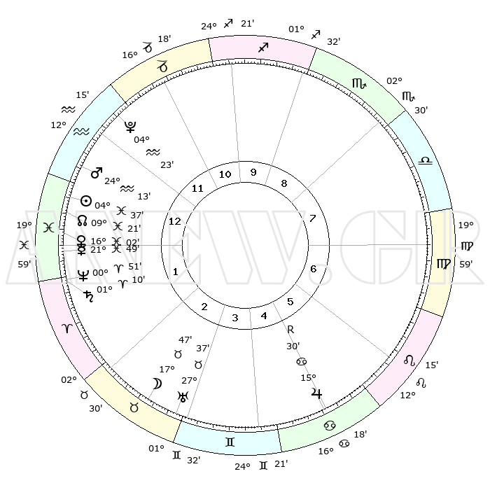 | | ΘΕΣΕΙΣ ΠΛΑΝΗΤΩΝ ΑΣΤΡΟΛΟΓΙΚΟΥ ΧΑΡΤΗ ΤΗΣ ΣΤΙΓΜΗΣ ΑΥΤΗΣ | | | | Πλανήτης | Ζώδιο | Μοίρες | Δεκαήμ. | Σε οίκο | Απόκλιση | | Ακμές των οίκων | | Ηλιος | Ιχθείς | 04°33' | Πρώτο | 1 | 09 S 50 | | 1ος | 09°47' | Υδροχόος | | Σελήνη | Ταύρος | 16°43' | Δεύτερο | 3 | 21 N 31 | | 2ος | 25°08' | Ιχθείς | | Ερμής | Ιχθείς | 21°46' | Τρίτο | 1 | 01 S 22 | | 3ος | 01°52' | Ταύρος | | Αφροδίτη | Ιχθείς | 15°57' | Δεύτερο | 1 | 06 S 52 | | 4ος | 28°45' | Ταύρος | | Αρης | Υδροχόος | 24°09' | Τρίτο | 1 | 14 S 30 | | 5ος | 20°56' | Δίδυμοι | | Δίας | Καρκίνος | 15°30'R | Δεύτερο | 6 | 22 N 52 | | 6ος | 12°49' | Καρκίνος | | Κρόνος | Κριός | 01°09' | Πρώτο | 2 | 01 S 30 | | 7ος | 09°47' | Λέων | | Ουρανός | Ταύρος | 27°37' | Τρίτο | 3 | 19 N 27 | | 8ος | 25°08' | Παρθένος | | Ποσειδώνας | Κριός | 00°51' | Πρώτο | 2 | 00 S 52 | | 9ος | 01°52' | Σκορπιός | | Πλούτωνας | Υδροχόος | 04°23' | Πρώτο | 12 | 22 S 54 | | 10ος | 28°45' | Σκορπιός | | Β. Δεσμός | Ιχθείς | 09°21' | Πρώτο | 1 | 08 S 04 | | 11ος | 20°56' | Τοξότης | | Ωροσκόπος | Υδροχόος | 09°47' | Πρώτο | | | 12ος | 12°49' | Αιγόκερως | | Μεσουράνημα | Σκορπιός | 28°45' | Τρίτο | | | |