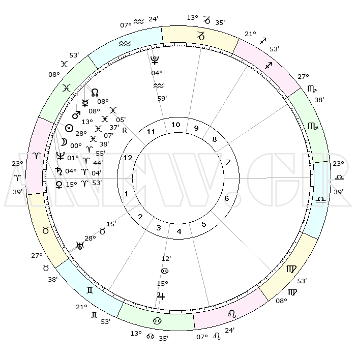 | | ΘΕΣΕΙΣ ΠΛΑΝΗΤΩΝ ΑΣΤΡΟΛΟΓΙΚΟΥ ΧΑΡΤΗ ΤΗΣ ΣΤΙΓΜΗΣ ΑΥΤΗΣ | | | | Πλανήτης | Ζώδιο | Μοίρες | Δεκαήμ. | Σε οίκο | Απόκλιση | | Ακμές των οίκων | | Ηλιος | Ιχθείς | 28°34' | Τρίτο | 1 | 00 S 34 | | 1ος | 10°31' | Ιχθείς | | Σελήνη | Ιχθείς | 29°53' | Τρίτο | 1 | 01 N 41 | | 2ος | 24°43' | Κριός | | Ερμής | Ιχθείς | 08°38'R | Πρώτο | 12 | 07 S 02 | | 3ος | 25°25' | Ταύρος | | Αφροδίτη | Κριός | 15°47' | Δεύτερο | 1 | 05 N 22 | | 4ος | 18°54' | Δίδυμοι | | Αρης | Ιχθείς | 13°03' | Δεύτερο | 1 | 07 S 39 | | 5ος | 10°38' | Καρκίνος | | Δίας | Καρκίνος | 15°11' | Δεύτερο | 5 | 22 N 56 | | 6ος | 05°22' | Λέων | | Κρόνος | Κριός | 04°04' | Πρώτο | 1 | 00 S 20 | | 7ος | 10°31' | Παρθένος | | Ουρανός | Ταύρος | 28°15' | Τρίτο | 3 | 19 N 36 | | 8ος | 24°43' | Ζυγός | | Ποσειδώνας | Κριός | 01°43' | Πρώτο | 1 | 00 S 31 | | 9ος | 25°25' | Σκορπιός | | Πλούτωνας | Υδροχόος | 04°59' | Πρώτο | 11 | 22 S 49 | | 10ος | 18°54' | Τοξότης | | Β. Δεσμός | Ιχθείς | 08°05' | Πρώτο | 12 | 08 S 32 | | 11ος | 10°38' | Αιγόκερως | | Ωροσκόπος | Ιχθείς | 10°31' | Δεύτερο | | | 12ος | 05°22' | Υδροχόος | | Μεσουράνημα | Τοξότης | 18°54' | Δεύτερο | | | |