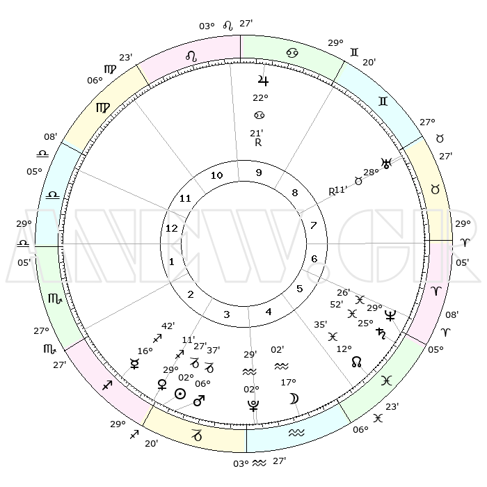 | | ΘΕΣΕΙΣ ΠΛΑΝΗΤΩΝ ΑΣΤΡΟΛΟΓΙΚΟΥ ΧΑΡΤΗ ΤΗΣ ΣΤΙΓΜΗΣ ΑΥΤΗΣ | | | | Πλανήτης | Ζώδιο | Μοίρες | Δεκαήμ. | Σε οίκο | Απόκλιση | | Ακμές των οίκων | | Ηλιος | Αιγόκερως | 02°21' | Πρώτο | 3 | 23 S 25 | | 1ος | 03°25' | Ζυγός | | Σελήνη | Υδροχόος | 15°56' | Δεύτερο | 5 | 18 S 08 | | 2ος | 00°14' | Σκορπιός | | Ερμής | Τοξότης | 16°34' | Δεύτερο | 3 | 22 S 22 | | 3ος | 00°48' | Τοξότης | | Αφροδίτη | Τοξότης | 29°04' | Τρίτο | 3 | 23 S 37 | | 4ος | 03°50' | Αιγόκερως | | Αρης | Αιγόκερως | 06°33' | Πρώτο | 4 | 24 S 06 | | 5ος | 06°47' | Υδροχόος | | Δίας | Καρκίνος | 22°22'R | Τρίτο | 10 | 21 N 48 | | 6ος | 07°05' | Ιχθείς | | Κρόνος | Ιχθείς | 25°52' | Τρίτο | 6 | 03 S 44 | | 7ος | 03°25' | Κριός | | Ουρανός | Ταύρος | 28°11'R | Τρίτο | 8 | 19 N 33 | | 8ος | 00°14' | Ταύρος | | Ποσειδώνας | Ιχθείς | 29°26' | Τρίτο | 6 | 01 S 27 | | 9ος | 00°48' | Δίδυμοι | | Πλούτωνας | Υδροχόος | 02°29' | Πρώτο | 4 | 23 S 16 | | 10ος | 03°50' | Καρκίνος | | Β. Δεσμός | Ιχθείς | 12°36' | Δεύτερο | 6 | 06 S 50 | | 11ος | 06°47' | Λέων | | Ωροσκόπος | Ζυγός | 03°25' | Πρώτο | | | 12ος | 07°05' | Παρθένος | | Μεσουράνημα | Καρκίνος | 03°50' | Πρώτο | | | |