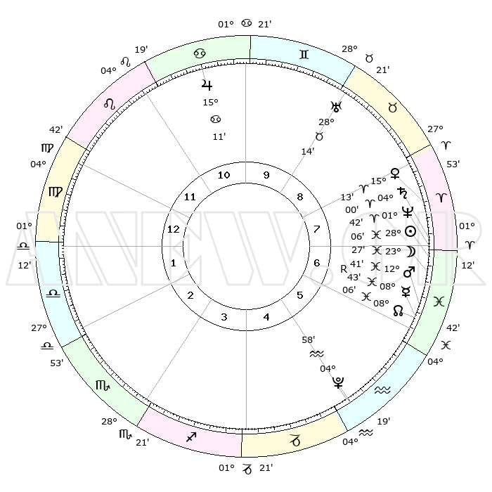 | | ΘΕΣΕΙΣ ΠΛΑΝΗΤΩΝ ΑΣΤΡΟΛΟΓΙΚΟΥ ΧΑΡΤΗ ΤΗΣ ΣΤΙΓΜΗΣ ΑΥΤΗΣ | | | | Πλανήτης | Ζώδιο | Μοίρες | Δεκαήμ. | Σε οίκο | Απόκλιση | | Ακμές των οίκων | | Ηλιος | Ιχθείς | 28°02' | Τρίτο | 7 | 00 S 47 | | 1ος | 09°08' | Παρθένος | | Σελήνη | Ιχθείς | 22°25' | Τρίτο | 7 | 01 S 53 | | 2ος | 03°55' | Ζυγός | | Ερμής | Ιχθείς | 08°44'R | Πρώτο | 6 | 06 S 53 | | 3ος | 03°19' | Σκορπιός | | Αφροδίτη | Κριός | 15°08' | Δεύτερο | 8 | 05 N 06 | | 4ος | 06°16' | Τοξότης | | Αρης | Ιχθείς | 12°38' | Δεύτερο | 7 | 07 S 49 | | 5ος | 09°54' | Αιγόκερως | | Δίας | Καρκίνος | 15°11' | Δεύτερο | 11 | 22 N 56 | | 6ος | 11°15' | Υδροχόος | | Κρόνος | Κριός | 03°60' | Πρώτο | 8 | 00 S 22 | | 7ος | 09°08' | Ιχθείς | | Ουρανός | Ταύρος | 28°14' | Τρίτο | 9 | 19 N 35 | | 8ος | 03°55' | Κριός | | Ποσειδώνας | Κριός | 01°42' | Πρώτο | 7 | 00 S 31 | | 9ος | 03°19' | Ταύρος | | Πλούτωνας | Υδροχόος | 04°58' | Πρώτο | 5 | 22 S 49 | | 10ος | 06°16' | Δίδυμοι | | Β. Δεσμός | Ιχθείς | 08°07' | Πρώτο | 6 | 08 S 32 | | 11ος | 09°54' | Καρκίνος | | Ωροσκόπος | Παρθένος | 09°08' | Πρώτο | | | 12ος | 11°15' | Λέων | | Μεσουράνημα | Δίδυμοι | 06°16' | Πρώτο | | | |