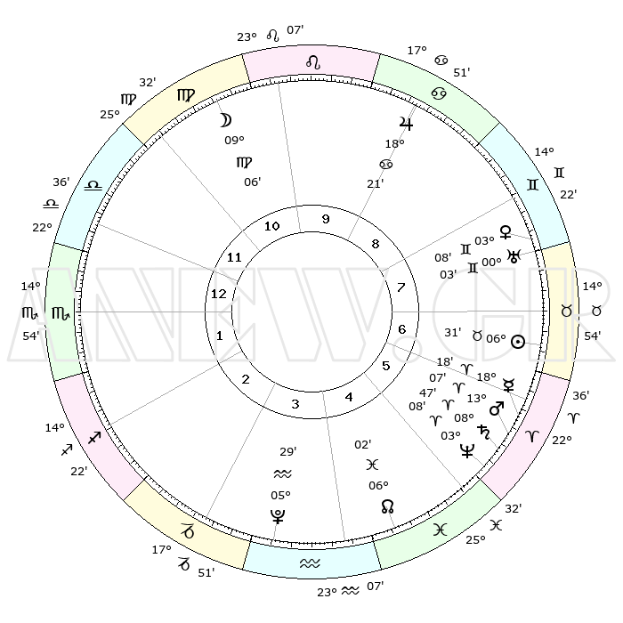 | | ΘΕΣΕΙΣ ΠΛΑΝΗΤΩΝ ΑΣΤΡΟΛΟΓΙΚΟΥ ΧΑΡΤΗ ΤΗΣ ΣΤΙΓΜΗΣ ΑΥΤΗΣ | | | | Πλανήτης | Ζώδιο | Μοίρες | Δεκαήμ. | Σε οίκο | Απόκλιση | | Ακμές των οίκων | | Ηλιος | Ταύρος | 06°27' | Πρώτο | 7 | 13 N 40 | | 1ος | 26°34' | Ζυγός | | Σελήνη | Παρθένος | 08°16' | Πρώτο | 11 | 08 N 23 | | 2ος | 24°47' | Σκορπιός | | Ερμής | Κριός | 18°12' | Δεύτερο | 6 | 04 N 59 | | 3ος | 26°29' | Τοξότης | | Αφροδίτη | Δίδυμοι | 03°04' | Πρώτο | 8 | 21 N 27 | | 4ος | 00°27' | Υδροχόος | | Αρης | Κριός | 13°04' | Δεύτερο | 6 | 04 N 19 | | 5ος | 03°23' | Ιχθείς | | Δίας | Καρκίνος | 18°20' | Δεύτερο | 9 | 22 N 34 | | 6ος | 02°21' | Κριός | | Κρόνος | Κριός | 08°46' | Πρώτο | 6 | 01 N 29 | | 7ος | 26°34' | Κριός | | Ουρανός | Δίδυμοι | 00°02' | Πρώτο | 8 | 20 N 00 | | 8ος | 24°47' | Ταύρος | | Ποσειδώνας | Κριός | 03°07' | Πρώτο | 6 | 00 N 02 | | 9ος | 26°29' | Δίδυμοι | | Πλούτωνας | Υδροχόος | 05°29' | Πρώτο | 4 | 22 S 48 | | 10ος | 00°27' | Λέων | | Β. Δεσμός | Ιχθείς | 06°03' | Πρώτο | 5 | 09 S 18 | | 11ος | 03°23' | Παρθένος | | Ωροσκόπος | Ζυγός | 26°34' | Τρίτο | | | 12ος | 02°21' | Ζυγός | | Μεσουράνημα | Λέων | 00°27' | Πρώτο | | | |