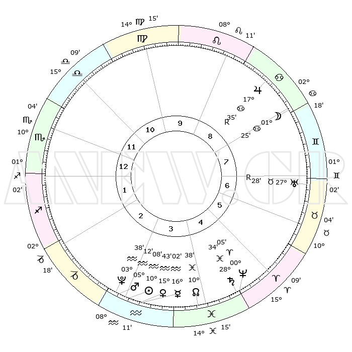| | ΘΕΣΕΙΣ ΠΛΑΝΗΤΩΝ ΑΣΤΡΟΛΟΓΙΚΟΥ ΧΑΡΤΗ ΤΗΣ ΣΤΙΓΜΗΣ ΑΥΤΗΣ | | | | Πλανήτης | Ζώδιο | Μοίρες | Δεκαήμ. | Σε οίκο | Απόκλιση | | Ακμές των οίκων | | Ηλιος | Υδροχόος | 10°05' | Δεύτερο | 3 | 17 S 43 | | 1ος | 14°41' | Σκορπιός | | Σελήνη | Καρκίνος | 00°36' | Πρώτο | 8 | 28 N 17 | | 2ος | 14°08' | Τοξότης | | Ερμής | Υδροχόος | 15°56' | Δεύτερο | 3 | 17 S 57 | | 3ος | 17°35' | Αιγόκερως | | Αφροδίτη | Υδροχόος | 15°39' | Δεύτερο | 3 | 17 S 25 | | 4ος | 22°50' | Υδροχόος | | Αρης | Υδροχόος | 05°09' | Πρώτο | 3 | 19 S 59 | | 5ος | 25°17' | Ιχθείς | | Δίας | Καρκίνος | 17°35'R | Δεύτερο | 8 | 22 N 35 | | 6ος | 22°21' | Κριός | | Κρόνος | Ιχθείς | 28°34' | Τρίτο | 5 | 02 S 34 | | 7ος | 14°41' | Ταύρος | | Ουρανός | Ταύρος | 27°28'R | Τρίτο | 7 | 19 N 24 | | 8ος | 14°08' | Δίδυμοι | | Ποσειδώνας | Κριός | 00°05' | Πρώτο | 5 | 01 S 10 | | 9ος | 17°35' | Καρκίνος | | Πλούτωνας | Υδροχόος | 03°38' | Πρώτο | 3 | 23 S 02 | | 10ος | 22°50' | Λέων | | Β. Δεσμός | Ιχθείς | 10°38' | Δεύτερο | 4 | 07 S 35 | | 11ος | 25°17' | Παρθένος | | Ωροσκόπος | Σκορπιός | 14°41' | Δεύτερο | | | 12ος | 22°21' | Ζυγός | | Μεσουράνημα | Λέων | 22°50' | Τρίτο | | | |