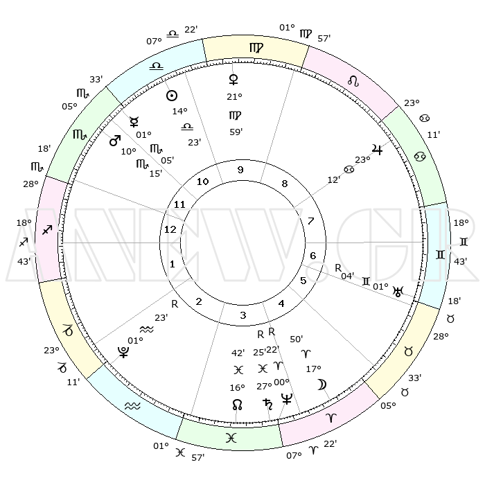 | ΘΕΣΕΙΣ ΠΛΑΝΗΤΩΝ ΑΣΤΡΟΛΟΓΙΚΟΥ ΧΑΡΤΗ ΤΗΣ ΣΤΙΓΜΗΣ ΑΥΤΗΣ | | Πλανήτης | Ζώδιο | Μοίρες | Δεκαήμ. | Σε οίκο | Απόκλιση | | Ακμές των οίκων | Ηλιος | Ζυγός | 14°18' | Δεύτερο | 11 | 05 S 38 | | 1ος | 23°30' | Σκορπιός | Σελήνη | Κριός | 16°34' | Δεύτερο | 5 | 08 N 48 | | 2ος | 23°50' | Τοξότης | Ερμής | Σκορπιός | 00°57' | Πρώτο | 11 | 12 S 37 | | 3ος | 28°30' | Αιγόκερως | Αφροδίτη | Παρθένος | 21°53' | Τρίτο | 10 | 04 N 31 | | 4ος | 04°18' | Ιχθείς | Αρης | Σκορπιός | 10°12' | Δεύτερο | 12 | 15 S 01 | | 5ος | 06°03' | Κριός | Δίας | Καρκίνος | 23°11' | Τρίτο | 8 | 21 N 28 | | 6ος | 01°59' | Ταύρος | Κρόνος | Ιχθείς | 27°25'R | Τρίτο | 4 | 03 S 20 | | 7ος | 23°30' | Ταύρος | Ουρανός | Δίδυμοι | 01°04'R | Πρώτο | 7 | 20 N 10 | | 8ος | 23°50' | Δίδυμοι | Ποσειδώνας | Κριός | 00°23'R | Πρώτο | 4 | 01 S 07 | | 9ος | 28°30' | Καρκίνος | Πλούτωνας | Υδροχόος | 01°23'R | Πρώτο | 3 | 23 S 32 | | 10ος | 04°18' | Παρθένος | Β. Δεσμός | Ιχθείς | 16°42' | Δεύτερο | 4 | 05 S 15 | | 11ος | 06°03' | Ζυγός | Ωροσκόπος | Σκορπιός | 23°30' | Τρίτο | | | 12ος | 01°59' | Σκορπιός | Μεσουράνημα | Παρθένος | 04°18' | Πρώτο | | | |