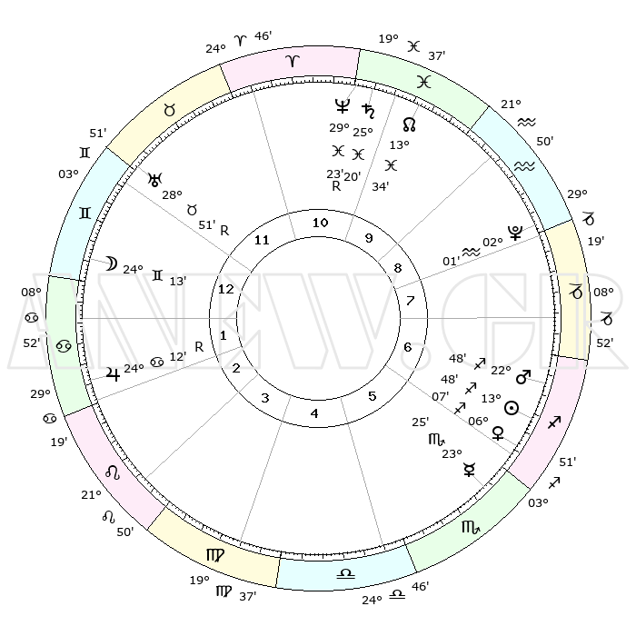 | | ΘΕΣΕΙΣ ΠΛΑΝΗΤΩΝ ΑΣΤΡΟΛΟΓΙΚΟΥ ΧΑΡΤΗ ΤΗΣ ΣΤΙΓΜΗΣ ΑΥΤΗΣ | | | | Πλανήτης | Ζώδιο | Μοίρες | Δεκαήμ. | Σε οίκο | Απόκλιση | | Ακμές των οίκων | | Ηλιος | Τοξότης | 13°46' | Δεύτερο | 6 | 22 S 27 | | 1ος | 27°50' | Δίδυμοι | | Σελήνη | Δίδυμοι | 23°42' | Τρίτο | 12 | 28 N 12 | | 2ος | 18°46' | Καρκίνος | | Ερμής | Σκορπιός | 23°23' | Τρίτο | 6 | 16 S 12 | | 3ος | 10°26' | Λέων | | Αφροδίτη | Τοξότης | 06°05' | Πρώτο | 6 | 20 S 48 | | 4ος | 06°25' | Παρθένος | | Αρης | Τοξότης | 22°46' | Τρίτο | 6 | 23 S 56 | | 5ος | 09°60' | Ζυγός | | Δίας | Καρκίνος | 24°12'R | Τρίτο | 2 | 21 N 26 | | 6ος | 20°08' | Σκορπιός | | Κρόνος | Ιχθείς | 25°20' | Τρίτο | 10 | 04 S 01 | | 7ος | 27°50' | Τοξότης | | Ουρανός | Ταύρος | 28°51'R | Τρίτο | 12 | 19 N 42 | | 8ος | 18°46' | Αιγόκερως | | Ποσειδώνας | Ιχθείς | 29°23'R | Τρίτο | 10 | 01 S 29 | | 9ος | 10°26' | Υδροχόος | | Πλούτωνας | Υδροχόος | 02°01' | Πρώτο | 8 | 23 S 23 | | 10ος | 06°25' | Ιχθείς | | Β. Δεσμός | Ιχθείς | 13°34' | Δεύτερο | 10 | 06 S 28 | | 11ος | 09°60' | Κριός | | Ωροσκόπος | Δίδυμοι | 27°50' | Τρίτο | | | 12ος | 20°08' | Ταύρος | | Μεσουράνημα | Ιχθείς | 06°25' | Πρώτο | | | |