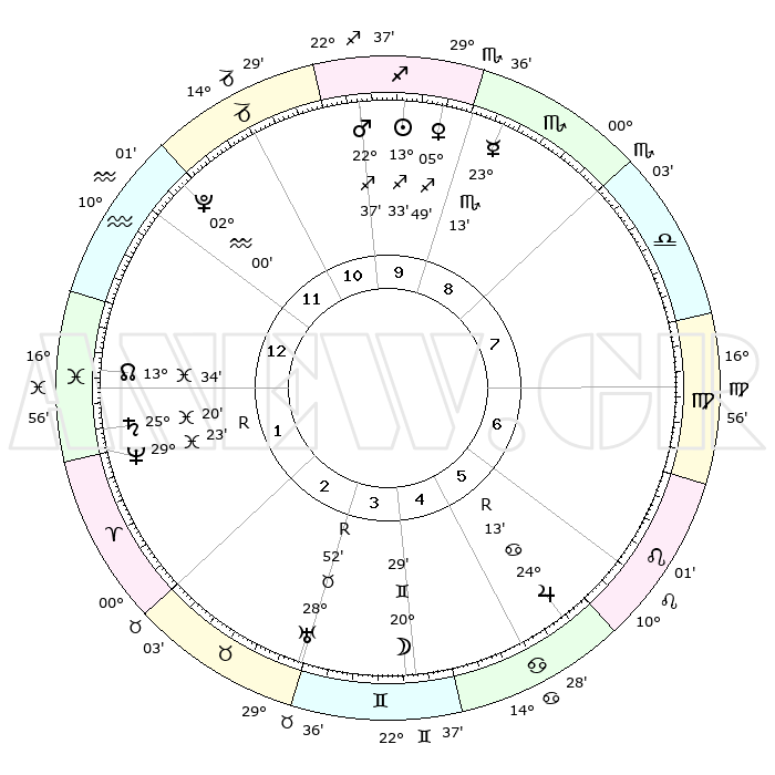 | | ΘΕΣΕΙΣ ΠΛΑΝΗΤΩΝ ΑΣΤΡΟΛΟΓΙΚΟΥ ΧΑΡΤΗ ΤΗΣ ΣΤΙΓΜΗΣ ΑΥΤΗΣ | | | | Πλανήτης | Ζώδιο | Μοίρες | Δεκαήμ. | Σε οίκο | Απόκλιση | | Ακμές των οίκων | | Ηλιος | Τοξότης | 13°32' | Δεύτερο | 9 | 22 S 25 | | 1ος | 01°40' | Ιχθείς | | Σελήνη | Δίδυμοι | 20°04' | Τρίτο | 4 | 28 N 01 | | 2ος | 16°57' | Κριός | | Ερμής | Σκορπιός | 23°12' | Τρίτο | 9 | 16 S 08 | | 3ος | 19°20' | Ταύρος | | Αφροδίτη | Τοξότης | 05°47' | Πρώτο | 9 | 20 S 44 | | 4ος | 13°34' | Δίδυμοι | | Αρης | Τοξότης | 22°36' | Τρίτο | 10 | 23 S 55 | | 5ος | 05°15' | Καρκίνος | | Δίας | Καρκίνος | 24°13'R | Τρίτο | 5 | 21 N 26 | | 6ος | 28°59' | Καρκίνος | | Κρόνος | Ιχθείς | 25°20' | Τρίτο | 1 | 04 S 01 | | 7ος | 01°40' | Παρθένος | | Ουρανός | Ταύρος | 28°52'R | Τρίτο | 3 | 19 N 42 | | 8ος | 16°57' | Ζυγός | | Ποσειδώνας | Ιχθείς | 29°23'R | Τρίτο | 1 | 01 S 29 | | 9ος | 19°20' | Σκορπιός | | Πλούτωνας | Υδροχόος | 02°00' | Πρώτο | 12 | 23 S 23 | | 10ος | 13°34' | Τοξότης | | Β. Δεσμός | Ιχθείς | 13°35' | Δεύτερο | 1 | 06 S 27 | | 11ος | 05°15' | Αιγόκερως | | Ωροσκόπος | Ιχθείς | 01°40' | Πρώτο | | | 12ος | 28°59' | Αιγόκερως | | Μεσουράνημα | Τοξότης | 13°34' | Δεύτερο | | | |