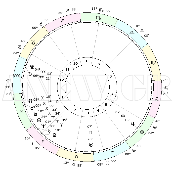 | | ΘΕΣΕΙΣ ΠΛΑΝΗΤΩΝ ΑΣΤΡΟΛΟΓΙΚΟΥ ΧΑΡΤΗ ΤΗΣ ΣΤΙΓΜΗΣ ΑΥΤΗΣ | | | | Πλανήτης | Ζώδιο | Μοίρες | Δεκαήμ. | Σε οίκο | Απόκλιση | | Ακμές των οίκων | | Ηλιος | Ιχθείς | 24°30' | Τρίτο | 2 | 02 S 11 | | 1ος | 28°38' | Αιγόκερως | | Σελήνη | Υδροχόος | 05°39' | Πρώτο | 1 | 21 S 40 | | 2ος | 12°30' | Ιχθείς | | Ερμής | Ιχθείς | 10°11'R | Δεύτερο | 1 | 05 S 32 | | 3ος | 21°09' | Κριός | | Αφροδίτη | Κριός | 10°45' | Δεύτερο | 2 | 03 N 17 | | 4ος | 19°51' | Ταύρος | | Αρης | Ιχθείς | 09°51' | Πρώτο | 1 | 08 S 53 | | 5ος | 12°43' | Δίδυμοι | | Δίας | Καρκίνος | 15°07' | Δεύτερο | 6 | 22 N 56 | | 6ος | 04°06' | Καρκίνος | | Κρόνος | Κριός | 03°33' | Πρώτο | 2 | 00 S 32 | | 7ος | 28°38' | Καρκίνος | | Ουρανός | Ταύρος | 28°07' | Τρίτο | 4 | 19 N 34 | | 8ος | 12°30' | Παρθένος | | Ποσειδώνας | Κριός | 01°34' | Πρώτο | 2 | 00 S 34 | | 9ος | 21°09' | Ζυγός | | Πλούτωνας | Υδροχόος | 04°53' | Πρώτο | 1 | 22 S 49 | | 10ος | 19°51' | Σκορπιός | | Β. Δεσμός | Ιχθείς | 08°18' | Πρώτο | 1 | 08 S 27 | | 11ος | 12°43' | Τοξότης | | Ωροσκόπος | Αιγόκερως | 28°38' | Τρίτο | | | 12ος | 04°06' | Αιγόκερως | | Μεσουράνημα | Σκορπιός | 19°51' | Δεύτερο | | | |
