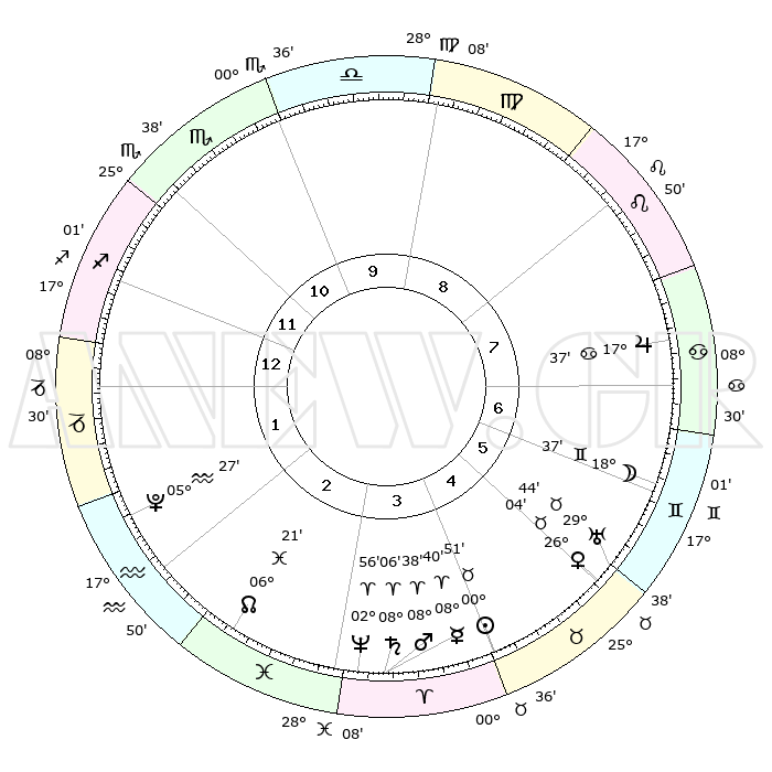 | | ΘΕΣΕΙΣ ΠΛΑΝΗΤΩΝ ΑΣΤΡΟΛΟΓΙΚΟΥ ΧΑΡΤΗ ΤΗΣ ΣΤΙΓΜΗΣ ΑΥΤΗΣ | | | | Πλανήτης | Ζώδιο | Μοίρες | Δεκαήμ. | Σε οίκο | Απόκλιση | | Ακμές των οίκων | | Ηλιος | Ταύρος | 00°47' | Πρώτο | 4 | 11 N 45 | | 1ος | 16°43' | Τοξότης | | Σελήνη | Δίδυμοι | 17°38' | Δεύτερο | 7 | 27 N 51 | | 2ος | 20°45' | Αιγόκερως | | Ερμής | Κριός | 08°33' | Πρώτο | 4 | 01 N 00 | | 3ος | 29°13' | Υδροχόος | | Αφροδίτη | Ταύρος | 25°59' | Τρίτο | 5 | 19 N 41 | | 4ος | 04°48' | Κριός | | Αρης | Κριός | 08°35' | Πρώτο | 4 | 02 N 32 | | 5ος | 03°20' | Ταύρος | | Δίας | Καρκίνος | 17°37' | Δεύτερο | 7 | 22 N 39 | | 6ος | 26°17' | Ταύρος | | Κρόνος | Κριός | 08°05' | Πρώτο | 4 | 01 N 14 | | 7ος | 16°43' | Δίδυμοι | | Ουρανός | Ταύρος | 29°44' | Τρίτο | 6 | 19 N 55 | | 8ος | 20°45' | Καρκίνος | | Ποσειδώνας | Κριός | 02°56' | Πρώτο | 3 | 00 S 03 | | 9ος | 29°13' | Λέων | | Πλούτωνας | Υδροχόος | 05°27' | Πρώτο | 2 | 22 S 48 | | 10ος | 04°48' | Ζυγός | | Β. Δεσμός | Ιχθείς | 06°21' | Πρώτο | 3 | 09 S 11 | | 11ος | 03°20' | Σκορπιός | | Ωροσκόπος | Τοξότης | 16°43' | Δεύτερο | | | 12ος | 26°17' | Σκορπιός | | Μεσουράνημα | Ζυγός | 04°48' | Πρώτο | | | |