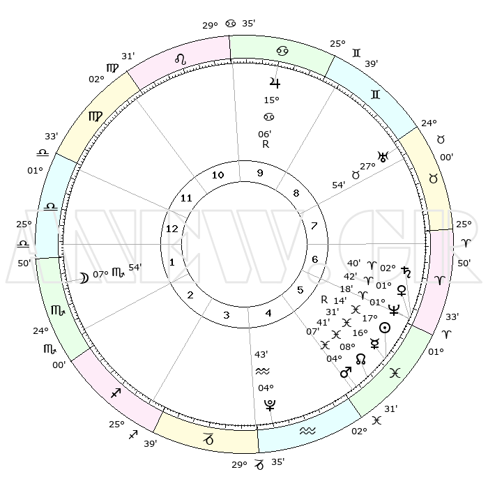 | | ΘΕΣΕΙΣ ΠΛΑΝΗΤΩΝ ΑΣΤΡΟΛΟΓΙΚΟΥ ΧΑΡΤΗ ΤΗΣ ΣΤΙΓΜΗΣ ΑΥΤΗΣ | | | | Πλανήτης | Ζώδιο | Μοίρες | Δεκαήμ. | Σε οίκο | Απόκλιση | | Ακμές των οίκων | | Ηλιος | Ιχθείς | 17°11' | Δεύτερο | 6 | 05 S 04 | | 1ος | 09°45' | Ζυγός | | Σελήνη | Σκορπιός | 07°14' | Πρώτο | 2 | 18 S 10 | | 2ος | 06°59' | Σκορπιός | | Ερμής | Ιχθείς | 16°35'R | Δεύτερο | 6 | 01 S 57 | | 3ος | 07°48' | Τοξότης | | Αφροδίτη | Κριός | 01°38' | Πρώτο | 6 | 00 S 29 | | 4ος | 10°59' | Αιγόκερως | | Αρης | Ιχθείς | 04°05' | Πρώτο | 5 | 11 S 02 | | 5ος | 13°54' | Υδροχόος | | Δίας | Καρκίνος | 15°06'R | Δεύτερο | 10 | 22 N 56 | | 6ος | 13°56' | Ιχθείς | | Κρόνος | Κριός | 02°39' | Πρώτο | 6 | 00 S 54 | | 7ος | 09°45' | Κριός | | Ουρανός | Ταύρος | 27°54' | Τρίτο | 8 | 19 N 31 | | 8ος | 06°59' | Ταύρος | | Ποσειδώνας | Κριός | 01°18' | Πρώτο | 6 | 00 S 41 | | 9ος | 07°48' | Δίδυμοι | | Πλούτωνας | Υδροχόος | 04°43' | Πρώτο | 4 | 22 S 51 | | 10ος | 10°59' | Καρκίνος | | Β. Δεσμός | Ιχθείς | 08°41' | Πρώτο | 5 | 08 S 19 | | 11ος | 13°54' | Λέων | | Ωροσκόπος | Ζυγός | 09°45' | Πρώτο | | | 12ος | 13°56' | Παρθένος | | Μεσουράνημα | Καρκίνος | 10°59' | Δεύτερο | | | |