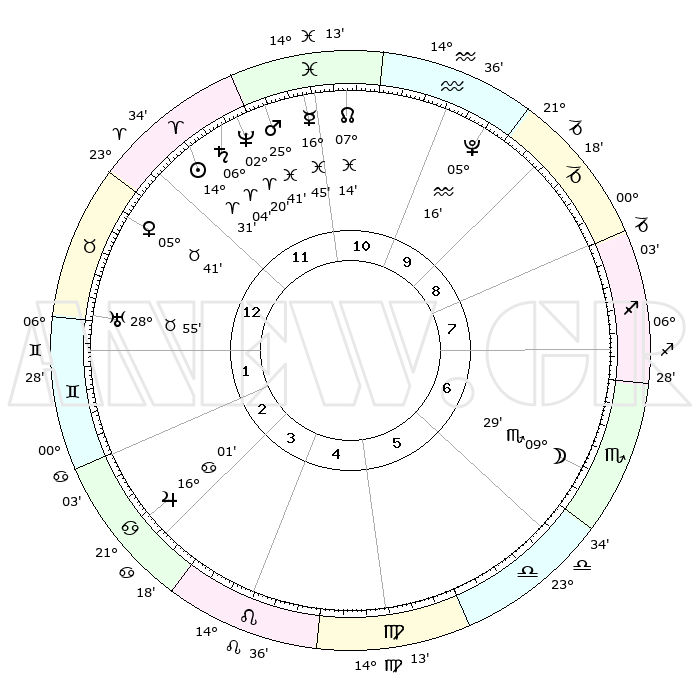 | | ΘΕΣΕΙΣ ΠΛΑΝΗΤΩΝ ΑΣΤΡΟΛΟΓΙΚΟΥ ΧΑΡΤΗ ΤΗΣ ΣΤΙΓΜΗΣ ΑΥΤΗΣ | | | | Πλανήτης | Ζώδιο | Μοίρες | Δεκαήμ. | Σε οίκο | Απόκλιση | | Ακμές των οίκων | | Ηλιος | Κριός | 14°27' | Δεύτερο | 12 | 05 N 42 | | 1ος | 04°53' | Ταύρος | | Σελήνη | Σκορπιός | 08°39' | Πρώτο | 7 | 18 S 37 | | 2ος | 05°46' | Δίδυμοι | | Ερμής | Ιχθείς | 16°41' | Δεύτερο | 11 | 06 S 53 | | 3ος | 28°51' | Δίδυμοι | | Αφροδίτη | Ταύρος | 05°36' | Πρώτο | 1 | 13 N 06 | | 4ος | 20°34' | Καρκίνος | | Αρης | Ιχθείς | 25°38' | Τρίτο | 12 | 02 S 41 | | 5ος | 15°29' | Λέων | | Δίας | Καρκίνος | 16°00' | Δεύτερο | 3 | 22 N 51 | | 6ος | 19°10' | Παρθένος | | Κρόνος | Κριός | 06°04' | Πρώτο | 12 | 00 N 27 | | 7ος | 04°53' | Σκορπιός | | Ουρανός | Ταύρος | 28°54' | Τρίτο | 1 | 19 N 45 | | 8ος | 05°46' | Τοξότης | | Ποσειδώνας | Κριός | 02°20' | Πρώτο | 12 | 00 S 17 | | 9ος | 28°51' | Τοξότης | | Πλούτωνας | Υδροχόος | 05°16' | Πρώτο | 10 | 22 S 47 | | 10ος | 20°34' | Αιγόκερως | | Β. Δεσμός | Ιχθείς | 07°14' | Πρώτο | 11 | 08 S 51 | | 11ος | 15°29' | Υδροχόος | | Ωροσκόπος | Ταύρος | 04°53' | Πρώτο | | | 12ος | 19°10' | Ιχθείς | | Μεσουράνημα | Αιγόκερως | 20°34' | Τρίτο | | | |