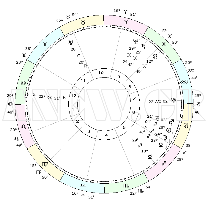 | | ΘΕΣΕΙΣ ΠΛΑΝΗΤΩΝ ΑΣΤΡΟΛΟΓΙΚΟΥ ΧΑΡΤΗ ΤΗΣ ΣΤΙΓΜΗΣ ΑΥΤΗΣ | | | | Πλανήτης | Ζώδιο | Μοίρες | Δεκαήμ. | Σε οίκο | Απόκλιση | | Ακμές των οίκων | | Ηλιος | Τοξότης | 28°00' | Τρίτο | 6 | 23 S 25 | | 1ος | 08°53' | Καρκίνος | | Σελήνη | Τοξότης | 23°29' | Τρίτο | 6 | 28 S 10 | | 2ος | 29°20' | Καρκίνος | | Ερμής | Τοξότης | 10°23' | Δεύτερο | 6 | 21 S 04 | | 3ος | 21°50' | Λέων | | Αφροδίτη | Τοξότης | 23°41' | Τρίτο | 6 | 23 S 18 | | 4ος | 19°37' | Παρθένος | | Αρης | Αιγόκερως | 03°18' | Πρώτο | 6 | 24 S 12 | | 5ος | 24°47' | Ζυγός | | Δίας | Καρκίνος | 22°52'R | Τρίτο | 1 | 21 N 42 | | 6ος | 03°52' | Τοξότης | | Κρόνος | Ιχθείς | 25°41' | Τρίτο | 10 | 03 S 50 | | 7ος | 08°53' | Αιγόκερως | | Ουρανός | Ταύρος | 28°20'R | Τρίτο | 11 | 19 N 35 | | 8ος | 29°20' | Αιγόκερως | | Ποσειδώνας | Ιχθείς | 29°24' | Τρίτο | 10 | 01 S 28 | | 9ος | 21°50' | Υδροχόος | | Πλούτωνας | Υδροχόος | 02°22' | Πρώτο | 8 | 23 S 18 | | 10ος | 19°37' | Ιχθείς | | Β. Δεσμός | Ιχθείς | 12°49' | Δεύτερο | 9 | 06 S 45 | | 11ος | 24°47' | Κριός | | Ωροσκόπος | Καρκίνος | 08°53' | Πρώτο | | | 12ος | 03°52' | Δίδυμοι | | Μεσουράνημα | Ιχθείς | 19°37' | Δεύτερο | | | |