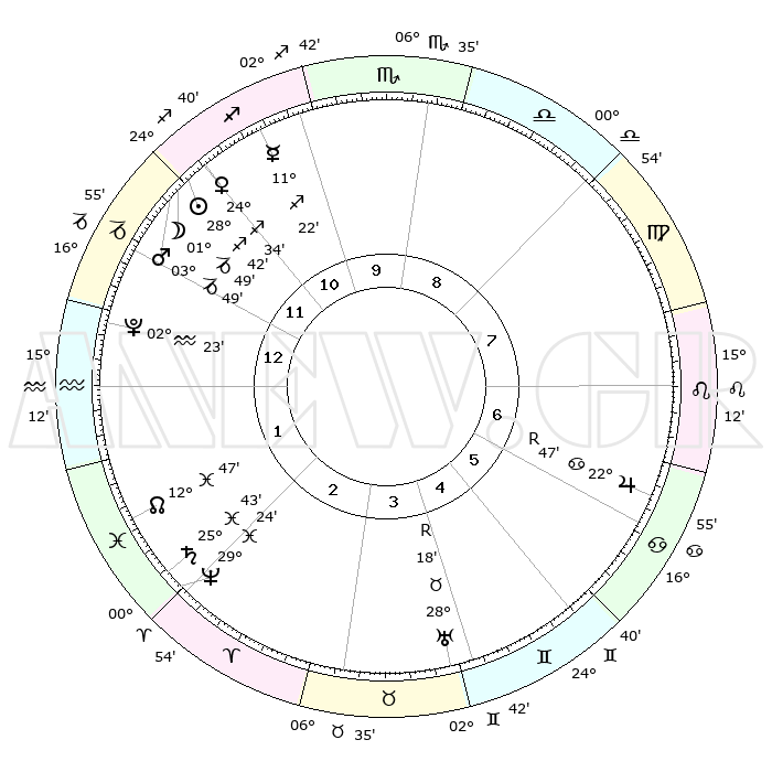 | | ΘΕΣΕΙΣ ΠΛΑΝΗΤΩΝ ΑΣΤΡΟΛΟΓΙΚΟΥ ΧΑΡΤΗ ΤΗΣ ΣΤΙΓΜΗΣ ΑΥΤΗΣ | | | | Πλανήτης | Ζώδιο | Μοίρες | Δεκαήμ. | Σε οίκο | Απόκλιση | | Ακμές των οίκων | | Ηλιος | Τοξότης | 28°38' | Τρίτο | 12 | 23 S 26 | | 1ος | 13°35' | Αιγόκερως | | Σελήνη | Αιγόκερως | 00°55' | Πρώτο | 12 | 28 S 10 | | 2ος | 24°11' | Υδροχόος | | Ερμής | Τοξότης | 11°16' | Δεύτερο | 11 | 21 S 16 | | 3ος | 04°23' | Κριός | | Αφροδίτη | Τοξότης | 24°28' | Τρίτο | 12 | 23 S 22 | | 4ος | 05°53' | Ταύρος | | Αρης | Αιγόκερως | 03°46' | Πρώτο | 12 | 24 S 11 | | 5ος | 00°15' | Δίδυμοι | | Δίας | Καρκίνος | 22°48'R | Τρίτο | 7 | 21 N 43 | | 6ος | 21°30' | Δίδυμοι | | Κρόνος | Ιχθείς | 25°43' | Τρίτο | 2 | 03 S 49 | | 7ος | 13°35' | Καρκίνος | | Ουρανός | Ταύρος | 28°18'R | Τρίτο | 4 | 19 N 35 | | 8ος | 24°11' | Λέων | | Ποσειδώνας | Ιχθείς | 29°24' | Τρίτο | 2 | 01 S 28 | | 9ος | 04°23' | Ζυγός | | Πλούτωνας | Υδροχόος | 02°23' | Πρώτο | 1 | 23 S 18 | | 10ος | 05°53' | Σκορπιός | | Β. Δεσμός | Ιχθείς | 12°47' | Δεύτερο | 2 | 06 S 45 | | 11ος | 00°15' | Τοξότης | | Ωροσκόπος | Αιγόκερως | 13°35' | Δεύτερο | | | 12ος | 21°30' | Τοξότης | | Μεσουράνημα | Σκορπιός | 05°53' | Πρώτο | | | |