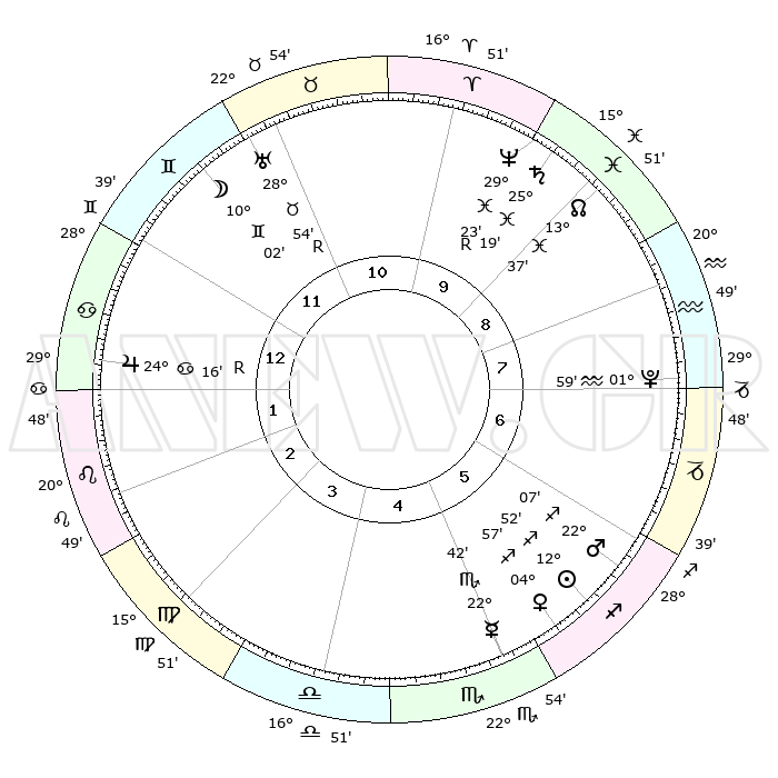 | | ΘΕΣΕΙΣ ΠΛΑΝΗΤΩΝ ΑΣΤΡΟΛΟΓΙΚΟΥ ΧΑΡΤΗ ΤΗΣ ΣΤΙΓΜΗΣ ΑΥΤΗΣ | | | | Πλανήτης | Ζώδιο | Μοίρες | Δεκαήμ. | Σε οίκο | Απόκλιση | | Ακμές των οίκων | | Ηλιος | Τοξότης | 12°50' | Δεύτερο | 5 | 22 S 20 | | 1ος | 21°48' | Καρκίνος | | Σελήνη | Δίδυμοι | 09°38' | Πρώτο | 11 | 26 N 49 | | 2ος | 12°25' | Λέων | | Ερμής | Σκορπιός | 22°41' | Τρίτο | 5 | 15 S 58 | | 3ος | 06°23' | Παρθένος | | Αφροδίτη | Τοξότης | 04°55' | Πρώτο | 5 | 20 S 33 | | 4ος | 06°16' | Ζυγός | | Αρης | Τοξότης | 22°05' | Τρίτο | 6 | 23 S 53 | | 5ος | 12°19' | Σκορπιός | | Δίας | Καρκίνος | 24°16'R | Τρίτο | 1 | 21 N 25 | | 6ος | 19°24' | Τοξότης | | Κρόνος | Ιχθείς | 25°19' | Τρίτο | 9 | 04 S 01 | | 7ος | 21°48' | Αιγόκερως | | Ουρανός | Ταύρος | 28°54'R | Τρίτο | 11 | 19 N 42 | | 8ος | 12°25' | Υδροχόος | | Ποσειδώνας | Ιχθείς | 29°23'R | Τρίτο | 9 | 01 S 29 | | 9ος | 06°23' | Ιχθείς | | Πλούτωνας | Υδροχόος | 01°59' | Πρώτο | 7 | 23 S 23 | | 10ος | 06°16' | Κριός | | Β. Δεσμός | Ιχθείς | 13°37' | Δεύτερο | 9 | 06 S 27 | | 11ος | 12°19' | Ταύρος | | Ωροσκόπος | Καρκίνος | 21°48' | Τρίτο | | | 12ος | 19°24' | Δίδυμοι | | Μεσουράνημα | Κριός | 06°16' | Πρώτο | | | |