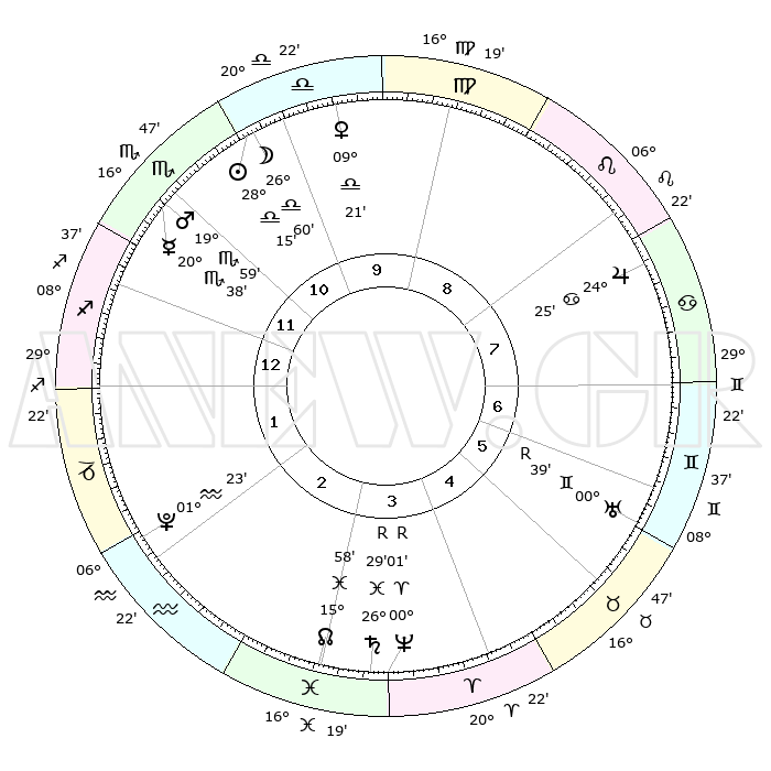 | ΘΕΣΕΙΣ ΠΛΑΝΗΤΩΝ ΑΣΤΡΟΛΟΓΙΚΟΥ ΧΑΡΤΗ ΤΗΣ ΣΤΙΓΜΗΣ ΑΥΤΗΣ | | Πλανήτης | Ζώδιο | Μοίρες | Δεκαήμ. | Σε οίκο | Απόκλιση | | Ακμές των οίκων | Ηλιος | Ζυγός | 27°54' | Τρίτο | 2 | 10 S 43 | | 1ος | 14°15' | Παρθένος | Σελήνη | Ζυγός | 22°45' | Τρίτο | 2 | 11 S 35 | | 2ος | 09°32' | Ζυγός | Ερμής | Σκορπιός | 20°11' | Τρίτο | 3 | 20 S 01 | | 3ος | 09°15' | Σκορπιός | Αφροδίτη | Ζυγός | 08°55' | Πρώτο | 1 | 02 S 07 | | 4ος | 12°11' | Τοξότης | Αρης | Σκορπιός | 19°44' | Δεύτερο | 3 | 17 S 56 | | 5ος | 15°35' | Αιγόκερως | Δίας | Καρκίνος | 24°24' | Τρίτο | 11 | 21 N 18 | | 6ος | 16°39' | Υδροχόος | Κρόνος | Ιχθείς | 26°30'R | Τρίτο | 7 | 03 S 41 | | 7ος | 14°15' | Ιχθείς | Ουρανός | Δίδυμοι | 00°40'R | Πρώτο | 9 | 20 N 05 | | 8ος | 09°32' | Κριός | Ποσειδώνας | Κριός | 00°02'R | Πρώτο | 7 | 01 S 15 | | 9ος | 09°15' | Ταύρος | Πλούτωνας | Υδροχόος | 01°23' | Πρώτο | 5 | 23 S 32 | | 10ος | 12°11' | Δίδυμοι | Β. Δεσμός | Ιχθείς | 15°59' | Δεύτερο | 7 | 05 S 32 | | 11ος | 15°35' | Καρκίνος | Ωροσκόπος | Παρθένος | 14°15' | Δεύτερο | | | 12ος | 16°39' | Λέων | Μεσουράνημα | Δίδυμοι | 12°11' | Δεύτερο | | | |