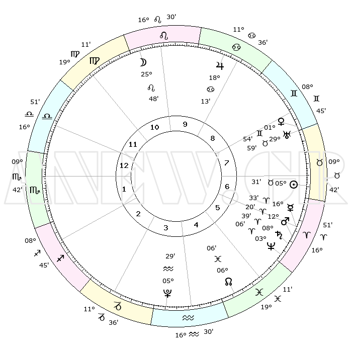 | | ΘΕΣΕΙΣ ΠΛΑΝΗΤΩΝ ΑΣΤΡΟΛΟΓΙΚΟΥ ΧΑΡΤΗ ΤΗΣ ΣΤΙΓΜΗΣ ΑΥΤΗΣ | | | | Πλανήτης | Ζώδιο | Μοίρες | Δεκαήμ. | Σε οίκο | Απόκλιση | | Ακμές των οίκων | | Ηλιος | Ταύρος | 05°28' | Πρώτο | 7 | 13 N 20 | | 1ος | 21°43' | Ζυγός | | Σελήνη | Λέων | 24°59' | Τρίτο | 10 | 14 N 13 | | 2ος | 19°39' | Σκορπιός | | Ερμής | Κριός | 16°26' | Δεύτερο | 6 | 04 N 15 | | 3ος | 21°02' | Τοξότης | | Αφροδίτη | Δίδυμοι | 01°50' | Πρώτο | 8 | 21 N 10 | | 4ος | 24°43' | Αιγόκερως | | Αρης | Κριός | 12°17' | Δεύτερο | 6 | 04 N 00 | | 5ος | 27°40' | Υδροχόος | | Δίας | Καρκίνος | 18°12' | Δεύτερο | 9 | 22 N 35 | | 6ος | 27°00' | Ιχθείς | | Κρόνος | Κριός | 08°39' | Πρώτο | 6 | 01 N 27 | | 7ος | 21°43' | Κριός | | Ουρανός | Ταύρος | 29°59' | Τρίτο | 8 | 19 N 59 | | 8ος | 19°39' | Ταύρος | | Ποσειδώνας | Κριός | 03°05' | Πρώτο | 6 | 00 N 01 | | 9ος | 21°02' | Δίδυμοι | | Πλούτωνας | Υδροχόος | 05°29' | Πρώτο | 4 | 22 S 48 | | 10ος | 24°43' | Καρκίνος | | Β. Δεσμός | Ιχθείς | 06°06' | Πρώτο | 5 | 09 S 16 | | 11ος | 27°40' | Λέων | | Ωροσκόπος | Ζυγός | 21°43' | Τρίτο | | | 12ος | 27°00' | Παρθένος | | Μεσουράνημα | Καρκίνος | 24°43' | Τρίτο | | | |