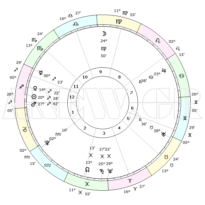 | | ΘΕΣΕΙΣ ΠΛΑΝΗΤΩΝ ΑΣΤΡΟΛΟΓΙΚΟΥ ΧΑΡΤΗ ΤΗΣ ΣΤΙΓΜΗΣ ΑΥΤΗΣ | | | | Πλανήτης | Ζώδιο | Μοίρες | Δεκαήμ. | Σε οίκο | Απόκλιση | | Ακμές των οίκων | | Ηλιος | Τοξότης | 20°23' | Τρίτο | 1 | 23 S 05 | | 1ος | 01°55' | Τοξότης | | Σελήνη | Παρθένος | 23°51' | Τρίτο | 10 | 01 N 34 | | 2ος | 03°19' | Αιγόκερως | | Ερμής | Τοξότης | 00°17' | Πρώτο | 12 | 18 S 22 | | 3ος | 09°20' | Υδροχόος | | Αφροδίτη | Τοξότης | 14°16' | Δεύτερο | 1 | 22 S 14 | | 4ος | 15°25' | Ιχθείς | | Αρης | Τοξότης | 27°39' | Τρίτο | 1 | 24 S 10 | | 5ος | 16°13' | Κριός | | Δίας | Καρκίνος | 23°39'R | Τρίτο | 8 | 21 N 33 | | 6ος | 10°60' | Ταύρος | | Κρόνος | Ιχθείς | 25°27' | Τρίτο | 4 | 03 S 57 | | 7ος | 01°55' | Δίδυμοι | | Ουρανός | Ταύρος | 28°36'R | Τρίτο | 6 | 19 N 39 | | 8ος | 03°19' | Καρκίνος | | Ποσειδώνας | Ιχθείς | 29°22' | Τρίτο | 4 | 01 S 29 | | 9ος | 09°20' | Λέων | | Πλούτωνας | Υδροχόος | 02°10' | Πρώτο | 2 | 23 S 20 | | 10ος | 15°25' | Παρθένος | | Β. Δεσμός | Ιχθείς | 13°13' | Δεύτερο | 3 | 06 S 36 | | 11ος | 16°13' | Ζυγός | | Ωροσκόπος | Τοξότης | 01°55' | Πρώτο | | | 12ος | 10°60' | Σκορπιός | | Μεσουράνημα | Παρθένος | 15°25' | Δεύτερο | | | |