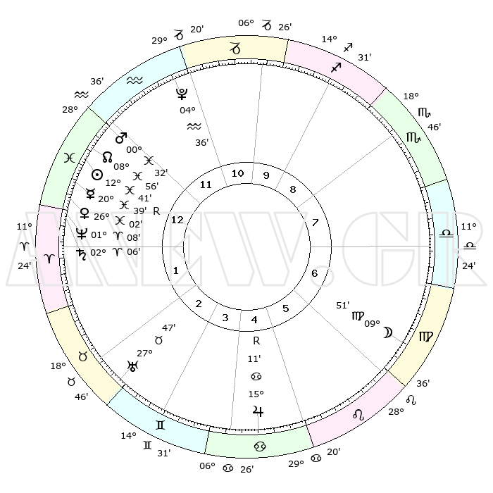 | | ΘΕΣΕΙΣ ΠΛΑΝΗΤΩΝ ΑΣΤΡΟΛΟΓΙΚΟΥ ΧΑΡΤΗ ΤΗΣ ΣΤΙΓΜΗΣ ΑΥΤΗΣ | | | | Πλανήτης | Ζώδιο | Μοίρες | Δεκαήμ. | Σε οίκο | Απόκλιση | | Ακμές των οίκων | | Ηλιος | Ιχθείς | 12°37' | Δεύτερο | 1 | 06 S 49 | | 1ος | 09°46' | Ιχθείς | | Σελήνη | Παρθένος | 09°08' | Πρώτο | 6 | 08 N 08 | | 2ος | 24°05' | Κριός | | Ερμής | Ιχθείς | 20°42'R | Τρίτο | 1 | 00 S 24 | | 3ος | 24°55' | Ταύρος | | Αφροδίτη | Ιχθείς | 25°58' | Τρίτο | 1 | 02 S 49 | | 4ος | 18°27' | Δίδυμοι | | Αρης | Ιχθείς | 00°29' | Πρώτο | 12 | 12 S 19 | | 5ος | 10°11' | Καρκίνος | | Δίας | Καρκίνος | 15°11'R | Δεύτερο | 5 | 22 N 55 | | 6ος | 04°49' | Λέων | | Κρόνος | Κριός | 02°06' | Πρώτο | 1 | 01 S 07 | | 7ος | 09°46' | Παρθένος | | Ουρανός | Ταύρος | 27°47' | Τρίτο | 3 | 19 N 29 | | 8ος | 24°05' | Ζυγός | | Ποσειδώνας | Κριός | 01°08' | Πρώτο | 1 | 00 S 45 | | 9ος | 24°55' | Σκορπιός | | Πλούτωνας | Υδροχόος | 04°36' | Πρώτο | 11 | 22 S 52 | | 10ος | 18°27' | Τοξότης | | Β. Δεσμός | Ιχθείς | 08°56' | Πρώτο | 12 | 08 S 13 | | 11ος | 10°11' | Αιγόκερως | | Ωροσκόπος | Ιχθείς | 09°46' | Πρώτο | | | 12ος | 04°49' | Υδροχόος | | Μεσουράνημα | Τοξότης | 18°27' | Δεύτερο | | | |