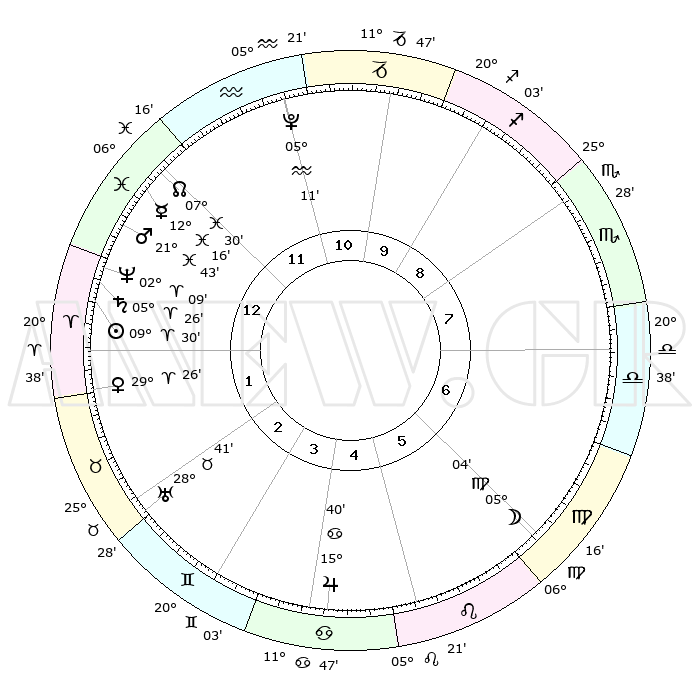 | | ΘΕΣΕΙΣ ΠΛΑΝΗΤΩΝ ΑΣΤΡΟΛΟΓΙΚΟΥ ΧΑΡΤΗ ΤΗΣ ΣΤΙΓΜΗΣ ΑΥΤΗΣ | | | | Πλανήτης | Ζώδιο | Μοίρες | Δεκαήμ. | Σε οίκο | Απόκλιση | | Ακμές των οίκων | | Ηλιος | Κριός | 09°26' | Πρώτο | 1 | 03 N 44 | | 1ος | 05°09' | Ιχθείς | | Σελήνη | Παρθένος | 04°02' | Πρώτο | 6 | 10 N 26 | | 2ος | 20°04' | Κριός | | Ερμής | Ιχθείς | 12°13' | Δεύτερο | 1 | 07 S 54 | | 3ος | 21°47' | Ταύρος | | Αφροδίτη | Κριός | 29°20' | Τρίτο | 2 | 10 N 45 | | 4ος | 15°42' | Δίδυμοι | | Αρης | Ιχθείς | 21°39' | Τρίτο | 1 | 04 S 16 | | 5ος | 07°24' | Καρκίνος | | Δίας | Καρκίνος | 15°40' | Δεύτερο | 5 | 22 N 53 | | 6ος | 01°30' | Λέων | | Κρόνος | Κριός | 05°26' | Πρώτο | 1 | 00 N 12 | | 7ος | 05°09' | Παρθένος | | Ουρανός | Ταύρος | 28°41' | Τρίτο | 3 | 19 N 42 | | 8ος | 20°04' | Ζυγός | | Ποσειδώνας | Κριός | 02°08' | Πρώτο | 1 | 00 S 21 | | 9ος | 21°47' | Σκορπιός | | Πλούτωνας | Υδροχόος | 05°11' | Πρώτο | 12 | 22 S 48 | | 10ος | 15°42' | Τοξότης | | Β. Δεσμός | Ιχθείς | 07°30' | Πρώτο | 1 | 08 S 45 | | 11ος | 07°24' | Αιγόκερως | | Ωροσκόπος | Ιχθείς | 05°09' | Πρώτο | | | 12ος | 01°30' | Υδροχόος | | Μεσουράνημα | Τοξότης | 15°42' | Δεύτερο | | | |