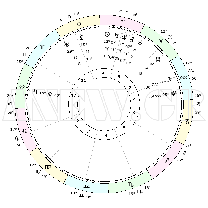 | | ΘΕΣΕΙΣ ΠΛΑΝΗΤΩΝ ΑΣΤΡΟΛΟΓΙΚΟΥ ΧΑΡΤΗ ΤΗΣ ΣΤΙΓΜΗΣ ΑΥΤΗΣ | | | | Πλανήτης | Ζώδιο | Μοίρες | Δεκαήμ. | Σε οίκο | Απόκλιση | | Ακμές των οίκων | | Ηλιος | Κριός | 22°27' | Τρίτο | 10 | 08 N 44 | | 1ος | 08°16' | Καρκίνος | | Σελήνη | Υδροχόος | 16°49' | Δεύτερο | 8 | 17 S 35 | | 2ος | 28°44' | Καρκίνος | | Ερμής | Ιχθείς | 26°12' | Τρίτο | 10 | 03 S 47 | | 3ος | 21°11' | Λέων | | Αφροδίτη | Ταύρος | 15°35' | Δεύτερο | 11 | 16 N 33 | | 4ος | 18°52' | Παρθένος | | Αρης | Κριός | 01°59' | Πρώτο | 10 | 00 S 08 | | 5ος | 23°57' | Ζυγός | | Δίας | Καρκίνος | 16°42' | Δεύτερο | 1 | 22 N 46 | | 6ος | 03°07' | Τοξότης | | Κρόνος | Κριός | 07°04' | Πρώτο | 10 | 00 N 50 | | 7ος | 08°16' | Αιγόκερως | | Ουρανός | Ταύρος | 29°18' | Τρίτο | 11 | 19 N 50 | | 8ος | 28°44' | Αιγόκερως | | Ποσειδώνας | Κριός | 02°38' | Πρώτο | 10 | 00 S 09 | | 9ος | 21°11' | Υδροχόος | | Πλούτωνας | Υδροχόος | 05°22' | Πρώτο | 8 | 22 S 47 | | 10ος | 18°52' | Ιχθείς | | Β. Δεσμός | Ιχθείς | 06°48' | Πρώτο | 9 | 09 S 01 | | 11ος | 23°57' | Κριός | | Ωροσκόπος | Καρκίνος | 08°16' | Πρώτο | | | 12ος | 03°07' | Δίδυμοι | | Μεσουράνημα | Ιχθείς | 18°52' | Δεύτερο | | | |