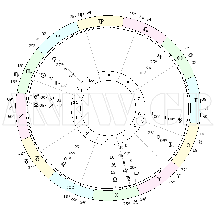 | | ΘΕΣΕΙΣ ΠΛΑΝΗΤΩΝ ΑΣΤΡΟΛΟΓΙΚΟΥ ΧΑΡΤΗ ΤΗΣ ΣΤΙΓΜΗΣ ΑΥΤΗΣ | | | | Πλανήτης | Ζώδιο | Μοίρες | Δεκαήμ. | Σε οίκο | Απόκλιση | | Ακμές των οίκων | | Ηλιος | Σκορπιός | 12°59' | Δεύτερο | 1 | 15 S 44 | | 1ος | 27°57' | Ζυγός | | Σελήνη | Ταύρος | 07°15' | Πρώτο | 7 | 17 N 38 | | 2ος | 26°14' | Σκορπιός | | Ερμής | Τοξότης | 05°28' | Πρώτο | 2 | 23 S 59 | | 3ος | 28°02' | Τοξότης | | Αφροδίτη | Ζυγός | 27°47' | Τρίτο | 12 | 09 S 21 | | 4ος | 02°05' | Υδροχόος | | Αρης | Τοξότης | 00°27' | Πρώτο | 2 | 20 S 40 | | 5ος | 05°01' | Ιχθείς | | Δίας | Καρκίνος | 25°05' | Τρίτο | 9 | 21 N 12 | | 6ος | 03°52' | Κριός | | Κρόνος | Ιχθείς | 25°45'R | Τρίτο | 5 | 03 S 57 | | 7ος | 27°57' | Κριός | | Ουρανός | Δίδυμοι | 00°07'R | Πρώτο | 8 | 19 N 58 | | 8ος | 26°14' | Ταύρος | | Ποσειδώνας | Ιχθείς | 29°43'R | Τρίτο | 5 | 01 S 22 | | 9ος | 28°02' | Δίδυμοι | | Πλούτωνας | Υδροχόος | 01°29' | Πρώτο | 3 | 23 S 30 | | 10ος | 02°05' | Λέων | | Β. Δεσμός | Ιχθείς | 15°11' | Δεύτερο | 5 | 05 S 50 | | 11ος | 05°01' | Παρθένος | | Ωροσκόπος | Ζυγός | 27°57' | Τρίτο | | | 12ος | 03°52' | Ζυγός | | Μεσουράνημα | Λέων | 02°05' | Πρώτο | | | |