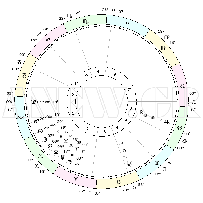 | | ΘΕΣΕΙΣ ΠΛΑΝΗΤΩΝ ΑΣΤΡΟΛΟΓΙΚΟΥ ΧΑΡΤΗ ΤΗΣ ΣΤΙΓΜΗΣ ΑΥΤΗΣ | | | | Πλανήτης | Ζώδιο | Μοίρες | Δεκαήμ. | Σε οίκο | Απόκλιση | | Ακμές των οίκων | | Ηλιος | Υδροχόος | 29°26' | Τρίτο | 2 | 11 S 40 | | 1ος | 03°31' | Αιγόκερως | | Σελήνη | Ιχθείς | 06°36' | Πρώτο | 2 | 09 S 17 | | 2ος | 11°33' | Υδροχόος | | Ερμής | Ιχθείς | 17°23' | Δεύτερο | 2 | 04 S 17 | | 3ος | 21°45' | Ιχθείς | | Αφροδίτη | Ιχθείς | 09°36' | Πρώτο | 2 | 09 S 19 | | 4ος | 25°07' | Κριός | | Αρης | Υδροχόος | 20°09' | Τρίτο | 2 | 15 S 47 | | 5ος | 20°53' | Ταύρος | | Δίας | Καρκίνος | 15°48'R | Δεύτερο | 7 | 22 N 50 | | 6ος | 12°29' | Δίδυμοι | | Κρόνος | Κριός | 00°34' | Πρώτο | 3 | 01 S 44 | | 7ος | 03°31' | Καρκίνος | | Ουρανός | Ταύρος | 27°33' | Τρίτο | 5 | 19 N 26 | | 8ος | 11°33' | Λέων | | Ποσειδώνας | Κριός | 00°40' | Πρώτο | 3 | 00 S 56 | | 9ος | 21°45' | Παρθένος | | Πλούτωνας | Υδροχόος | 04°14' | Πρώτο | 1 | 22 S 56 | | 10ος | 25°07' | Ζυγός | | Β. Δεσμός | Ιχθείς | 09°37' | Πρώτο | 2 | 07 S 58 | | 11ος | 20°53' | Σκορπιός | | Ωροσκόπος | Αιγόκερως | 03°31' | Πρώτο | | | 12ος | 12°29' | Τοξότης | | Μεσουράνημα | Ζυγός | 25°07' | Τρίτο | | | |
