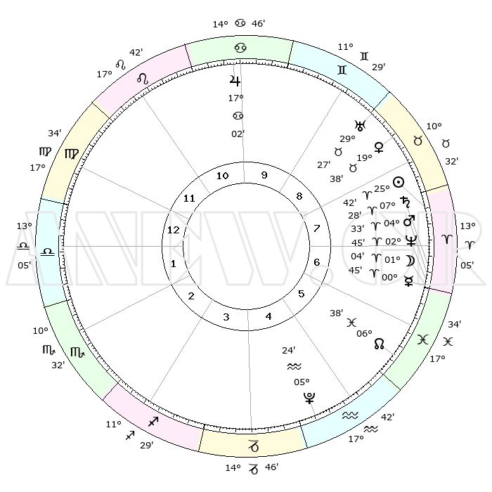 | | ΘΕΣΕΙΣ ΠΛΑΝΗΤΩΝ ΑΣΤΡΟΛΟΓΙΚΟΥ ΧΑΡΤΗ ΤΗΣ ΣΤΙΓΜΗΣ ΑΥΤΗΣ | | | | Πλανήτης | Ζώδιο | Μοίρες | Δεκαήμ. | Σε οίκο | Απόκλιση | | Ακμές των οίκων | | Ηλιος | Κριός | 25°37' | Τρίτο | 8 | 09 N 54 | | 1ος | 19°45' | Παρθένος | | Σελήνη | Ιχθείς | 29°57' | Τρίτο | 7 | 01 N 45 | | 2ος | 15°32' | Ζυγός | | Ερμής | Κριός | 00°38' | Πρώτο | 7 | 02 S 08 | | 3ος | 15°32' | Σκορπιός | | Αφροδίτη | Ταύρος | 19°32' | Δεύτερο | 9 | 17 N 48 | | 4ος | 18°28' | Τοξότης | | Αρης | Κριός | 04°30' | Πρώτο | 7 | 00 N 53 | | 5ος | 21°39' | Αιγόκερως | | Δίας | Καρκίνος | 17°02' | Δεύτερο | 10 | 22 N 44 | | 6ος | 22°29' | Υδροχόος | | Κρόνος | Κριός | 07°27' | Πρώτο | 7 | 00 N 59 | | 7ος | 19°45' | Ιχθείς | | Ουρανός | Ταύρος | 29°27' | Τρίτο | 9 | 19 N 52 | | 8ος | 15°32' | Κριός | | Ποσειδώνας | Κριός | 02°45' | Πρώτο | 7 | 00 S 07 | | 9ος | 15°32' | Ταύρος | | Πλούτωνας | Υδροχόος | 05°24' | Πρώτο | 5 | 22 S 47 | | 10ος | 18°28' | Δίδυμοι | | Β. Δεσμός | Ιχθείς | 06°38' | Πρώτο | 6 | 09 S 04 | | 11ος | 21°39' | Καρκίνος | | Ωροσκόπος | Παρθένος | 19°45' | Δεύτερο | | | 12ος | 22°29' | Λέων | | Μεσουράνημα | Δίδυμοι | 18°28' | Δεύτερο | | | |